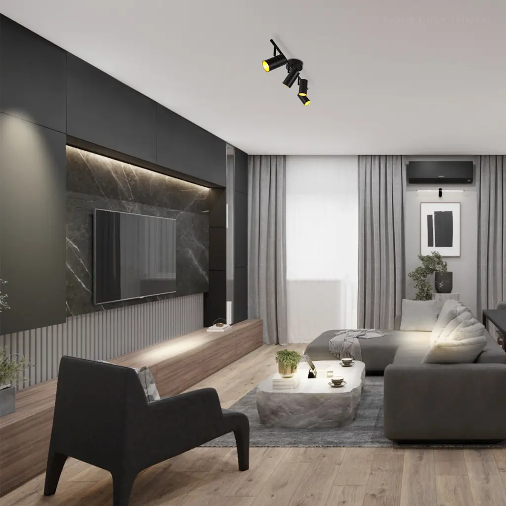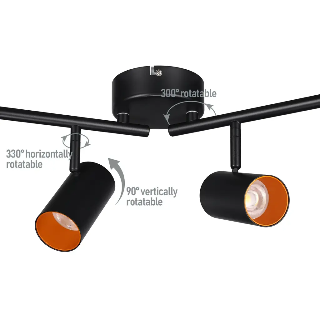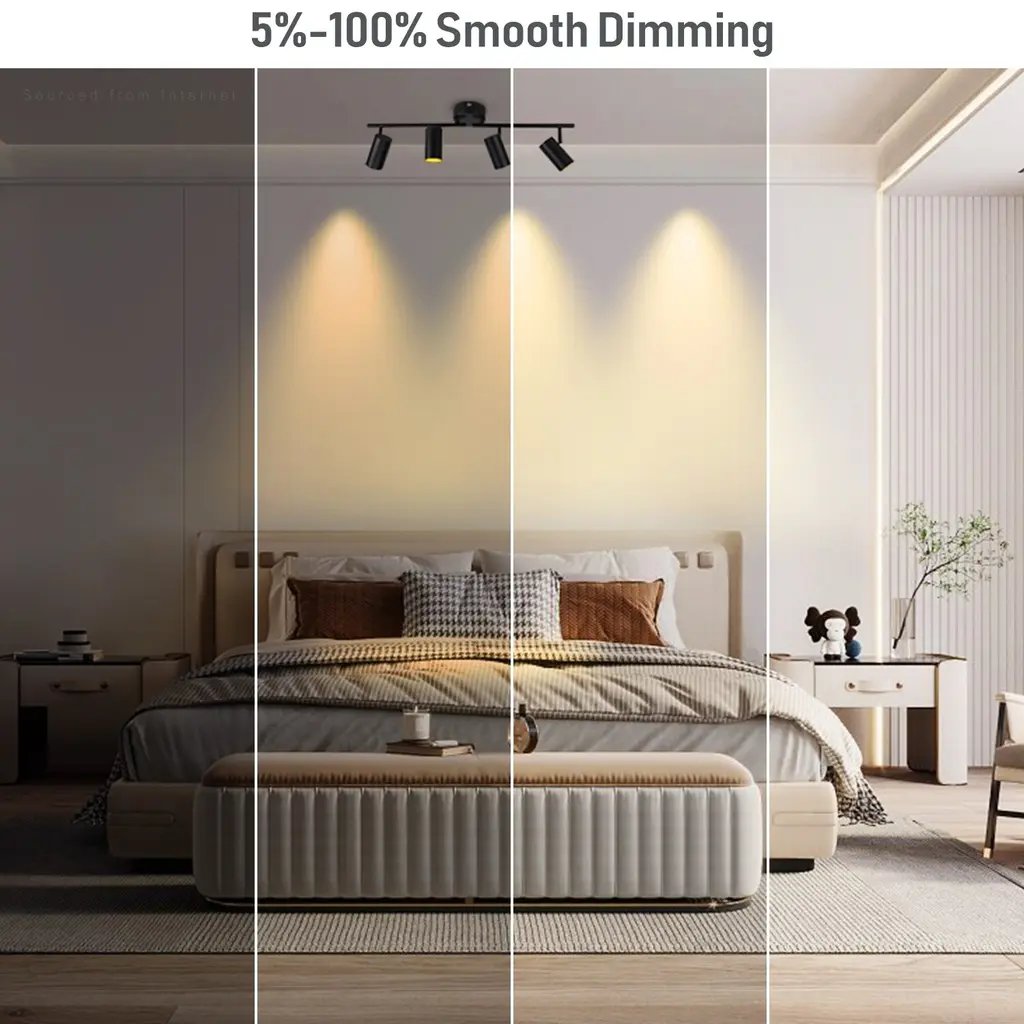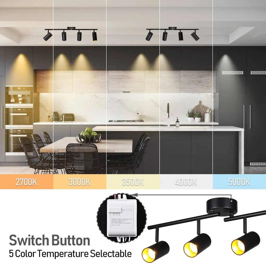 5CCT Selectable2700K/3000K/3500K/4000K/5000K, 5 optional color temperature and 5% 100% smooth dimming to meet your demands for the regulation of different brightness. 36W provides 3200LM output and CRI90 accentuates the natural colors of the surrounding environment.Adjustable Lighting DirectionAll 4 light heads are directional adjustable for living rooms, bedrooms, kitchens, islands and commercial Spaces with anti-glare coating to prevent glare.Energy SavingOnly 36W of power, save energy costs. The built-in wire is safer to use and more beautiful to look at, and the integrated high-quality LED chip is ideal for replacing traditional universal track lights without changing the bulb.Durable to UseThe durable die-cast aluminum material gives the product excellent thermal performance, extending the service life of the product to approximately 50,000hrs; The shading design of the gold spray layer shines softer light.WarrantyIt comes with a 3-year warranty to protect your rights and interests as a consumer.Specifications:Wattage: 36WEquivalent: 400WVoltage: AC110-277VLuminous flux: 2880lm/3200lmCCT: 2700K/3000K/3500K/4000K/5000KDimming range: 5%-100%Beam Angle: 45°Waterproof rating: IP45Working temperature: -13°F-140°FMaterial: Die-casted aluminumLifespan: 50,000hrs