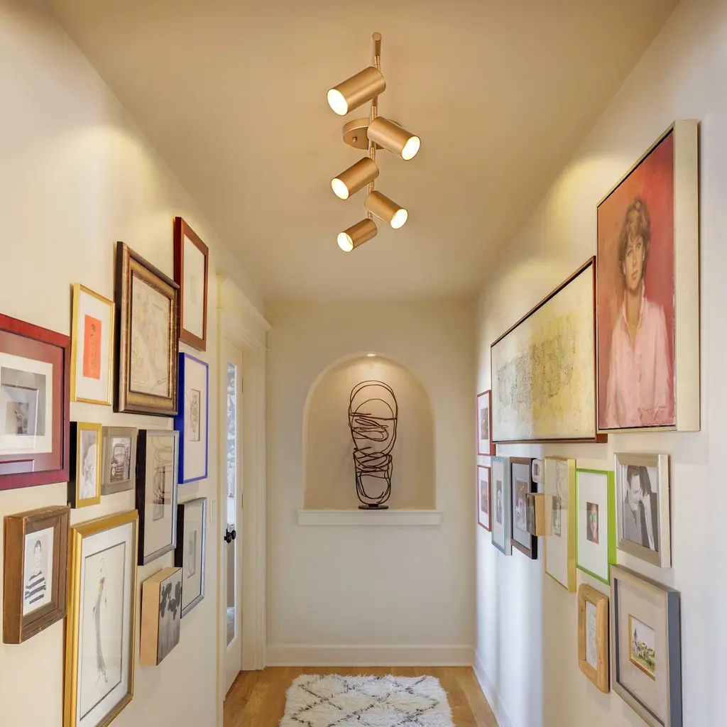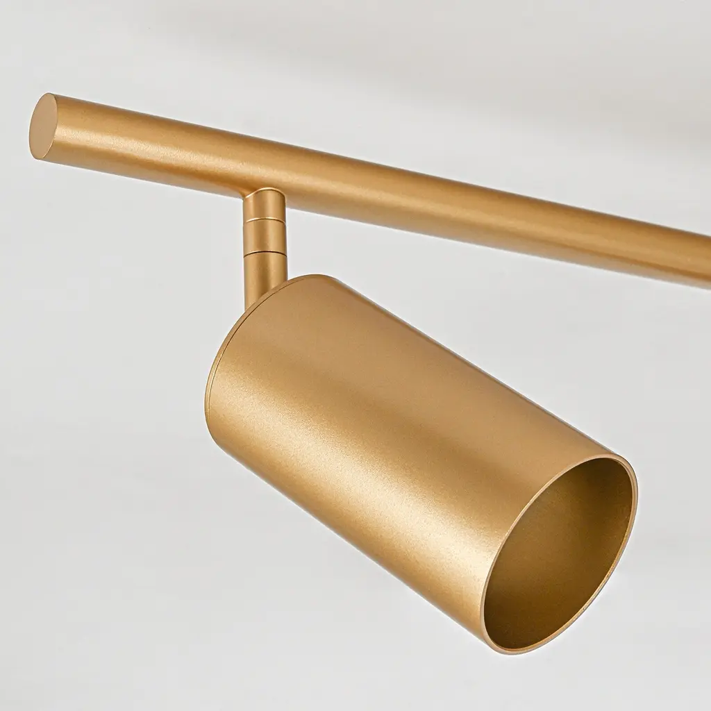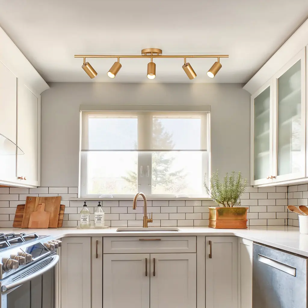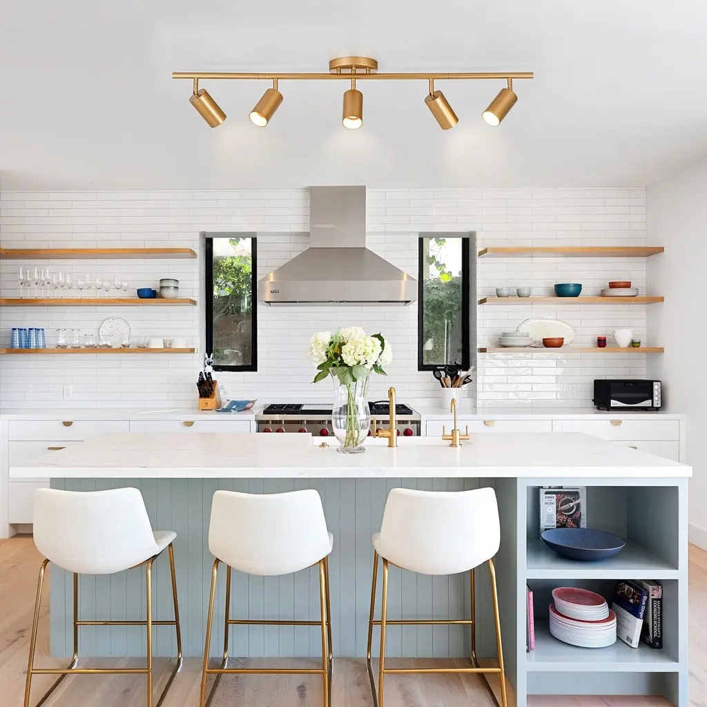 This linear track flush mount lighting has 4 cylindrical lights with gold finishes, giving it a luxurious feel. Each light can be individually adjusted 350 degree horizontally and 90 degree vertically so that you can point the light exactly where you need it. It is suitable for installation in kitchens, islands, dining rooms, living rooms, bars or areas with high ceilings. Features:Dimensions: