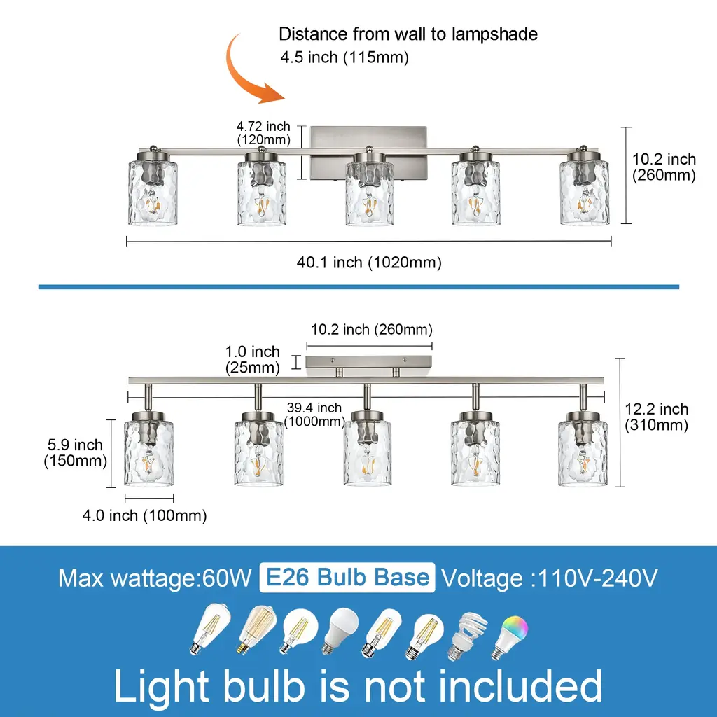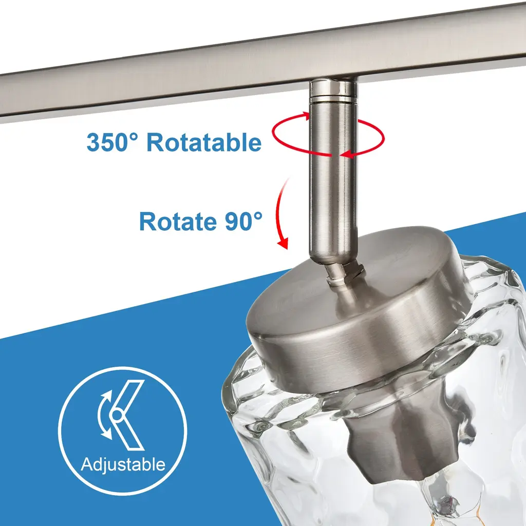 Clean lines arm design and classic brushed nickel finish, ideal for striking a balance between strength and elegant beauty. Encased in clear glass cylinder maximizes light output for an optimally bright ambience. Versatile Option Adjustable track heads and a rectangle canopy allow you to use this light fixture in a variety of different ways - use it on your ceiling as a traditional ceiling light or track light, or use it on your wall as a trendy vanity light. Easy Installation All mounting hardware required for installation and illustrated instructions are included in the package. Can be installed as ceiling lighting or vanity lighting. Bulb Requirements Use E26 base light bulbs, 60W Max. (not included). Fully dimmable when used with a dimmable bulb and compatible dimmer switch (not included). NOTE Please make sure you have cut off the electricity supply before installation. For the longer service life, Please use it in dry environment.