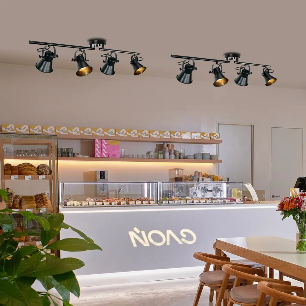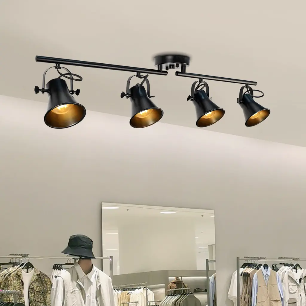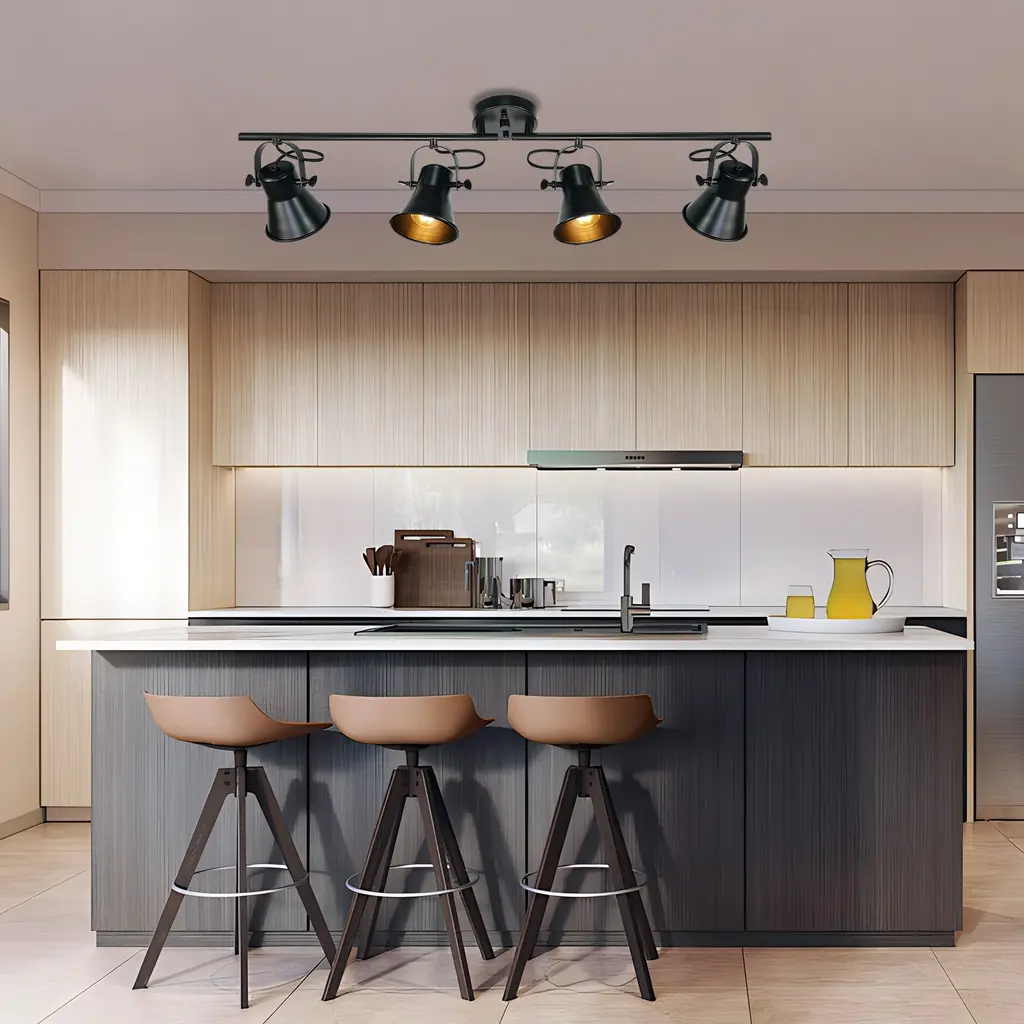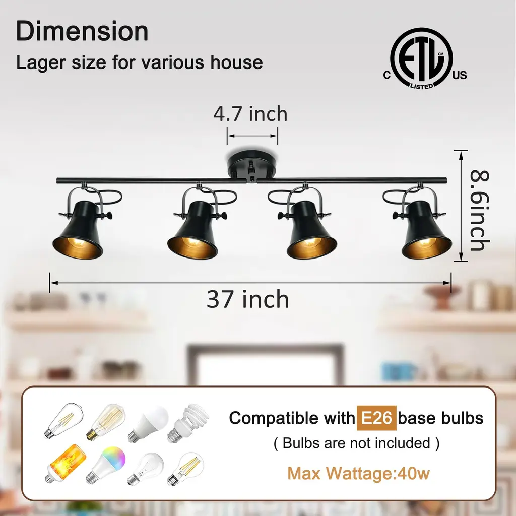 This ceiling track lighting is a great choice for your home décor. The pool table lights are accented with 4 black flared shades that envelop the light below, creating a warm and pleasant atmosphere. The horn shape of this pool table light is classic and retro, with an adjustable head design, the angle of the kitchen track lighting can be adjusted at will to illuminate any corner. Moreover, there is no restriction on the installation angle of this black track lighting fixture, whether it is a flat ceiling or a sloping ceiling, it can be installed and used. The unique appearance design makes it versatile, this modern track light fixture can be used in cafes, bars, photo walls, kitchens, dining rooms, corridors, office areas, and more.Feature