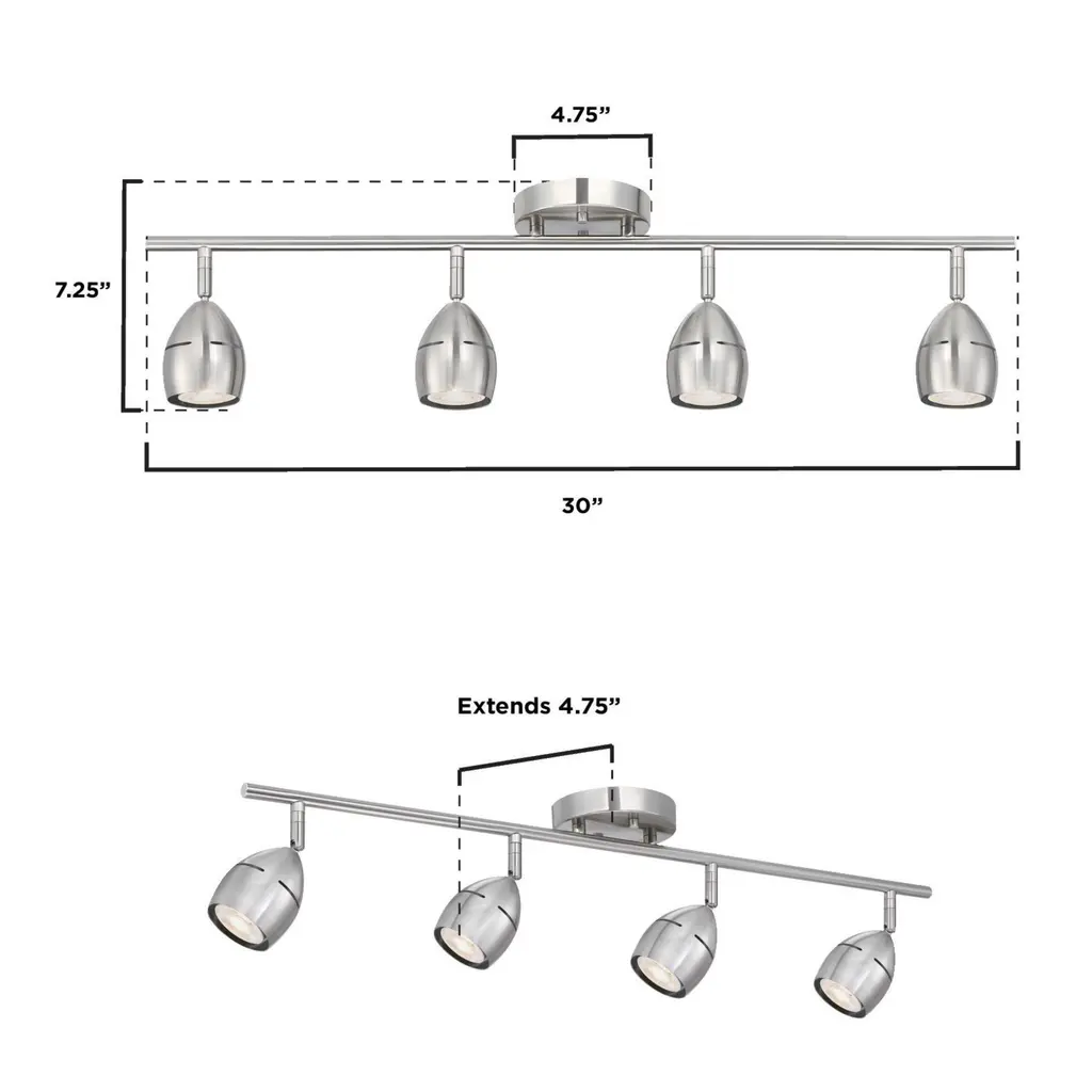 The Westinghouse Borgata track light kit adds bright directional lighting to any home. A sleek and streamlined linear style featuring a brushed nickel finish and four adjustable track heads. Ideal for task, general, and accent lighting, the Borgata includes energy-efficient MR16 LED bulbs for long-lasting illumination. This fixture is ETL/CETL listed for safety and backed by a five-year limited warranty against defects in materials and workmanship. Westinghouse is a trusted, global brand. Westinghouse knows lighting and offers products with exceptional quality, reliability, and functionality. Product reference number 61295.