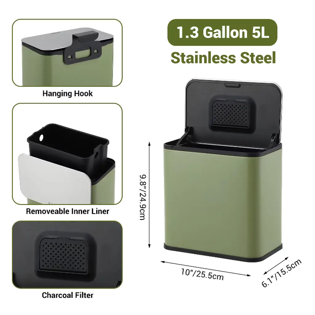 1.3 Gallon/5l Slim Trash Can With Lid, Stainless Steel Small Hanging Garbage Can With Inner Bucket & Charcoal Filter For Kitchen, Bathroom, Green