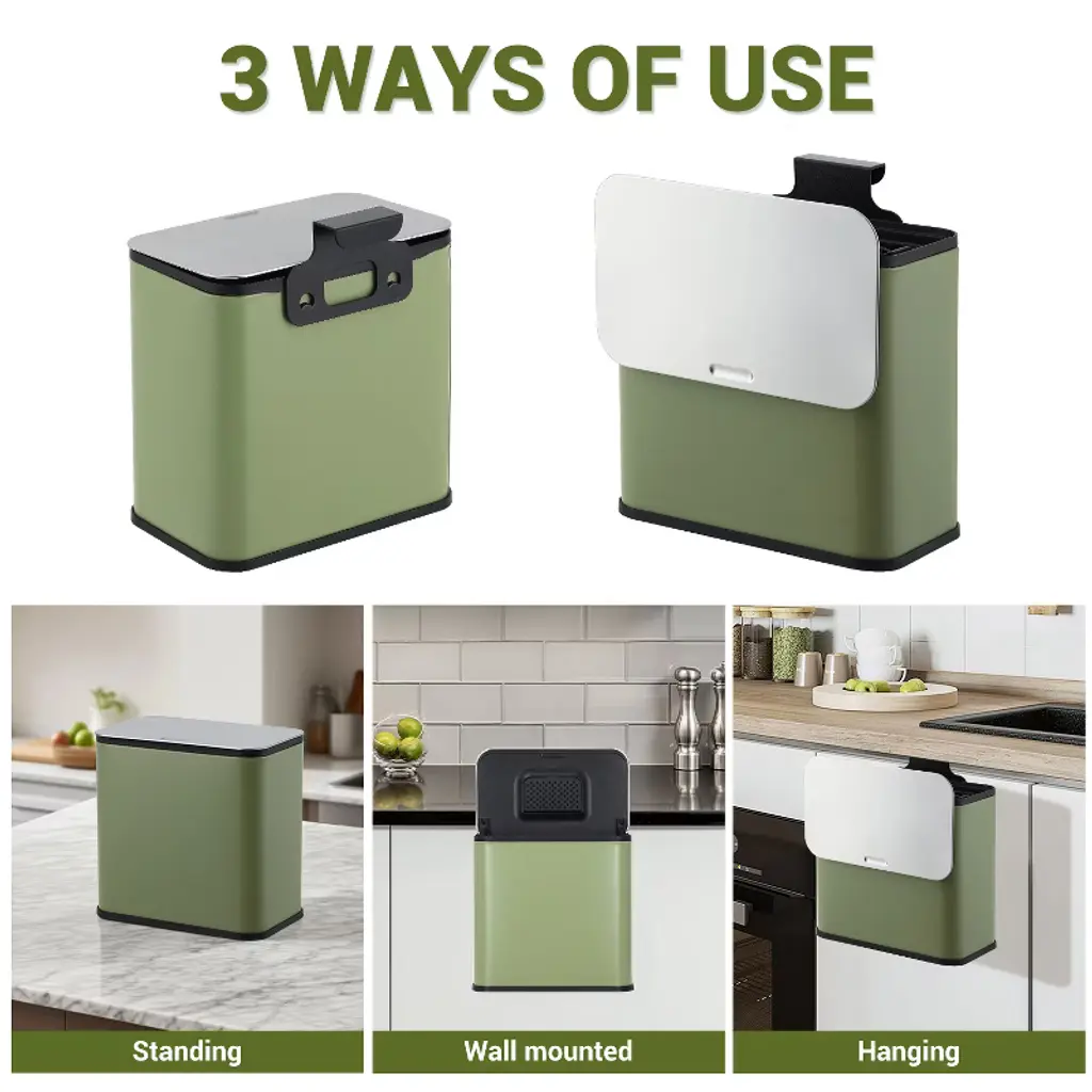 Introducing the 1.3 Gallon/5L Hanging Trash Can with Lid – the perfect solution for keeping your kitchen, bathroom, bedroom, or cupboard clean and organized. Crafted from durable stainless steel, this small trash bin combines functionality with a sleek design that fits seamlessly into any space. This hanging trash can is designed for convenience and efficiency. It features a sturdy lid to contain odors and keep your space fresh, while the inner bucket makes waste disposal and cleaning hassle-free. The included charcoal filter further helps to neutralize unpleasant smells, making it ideal for compost, kitchen waste, or everyday garbage. Whether you need a small kitchen bin for countertop use or an under-sink trash can, this versatile unit can be wall-mounted or hung inside cupboards to save floor space. Its compact size and modern look make it an excellent recycling bin or kitchen compost bin, perfect for managing kitchen scraps and reducing waste. Key Features: - Durable stainless steel construction for long-lasting use - 1.3 gallon/5L capacity ideal for small spaces - Hanging design saves counter and floor space - Lid with charcoal filter to control odors effectively - Inner bucket for easy removal and cleaning - Suitable for kitchen, bathroom, bedroom, cupboards, and more - Multi-purpose use as a compost bin, kitchen waste bin, or recycling bin Upgrade your waste management with the Hanging Trash Can – a small but mighty solution to keep your home tidy and odor-free. Perfect for those who value cleanliness, convenience, and style in their living spaces.