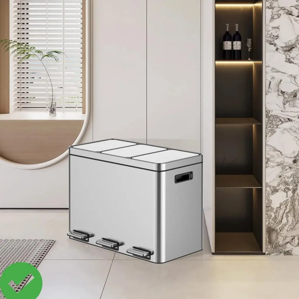 Feature:The trash can, crafted from high-quality stainless steel, offers a modern and sophisticated appearance while being practical for daily use. Featuring separate compartments, users can conveniently sort different types of waste, facilitating efficient recycling and disposal. Additionally, the soft-close lid feature of the garbage can ensures there is no loud slamming noise when the lid is closed adding a touch of convenience and consideration for a peaceful environment. The foot pedal allows for hands-free lid opening, promoting a hygienic waste disposal process. Additionally, the recycling bin's removable bucket with carrying handles enables easy removal for emptying or replacing garbage bags. These combined features provide a functional, long-lived, and hygienic waste disposal and recycling solution for homes or offices, offering convenience and organization in waste management practices. Specification:Material: Stainless steel and plasticSize: 37.60×63.00×46.80CMCapacity: 12 gallon(45L)/3×4 gallon(15L) compartments Packing list: 1 trash can with inner wastebasket (including instruction) Note:Before making a purchase, consider factors like height, width, depth and capacity to ensure the size of the item you are considering fits your need.
