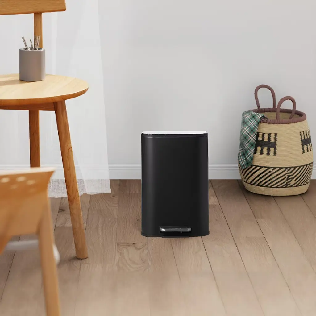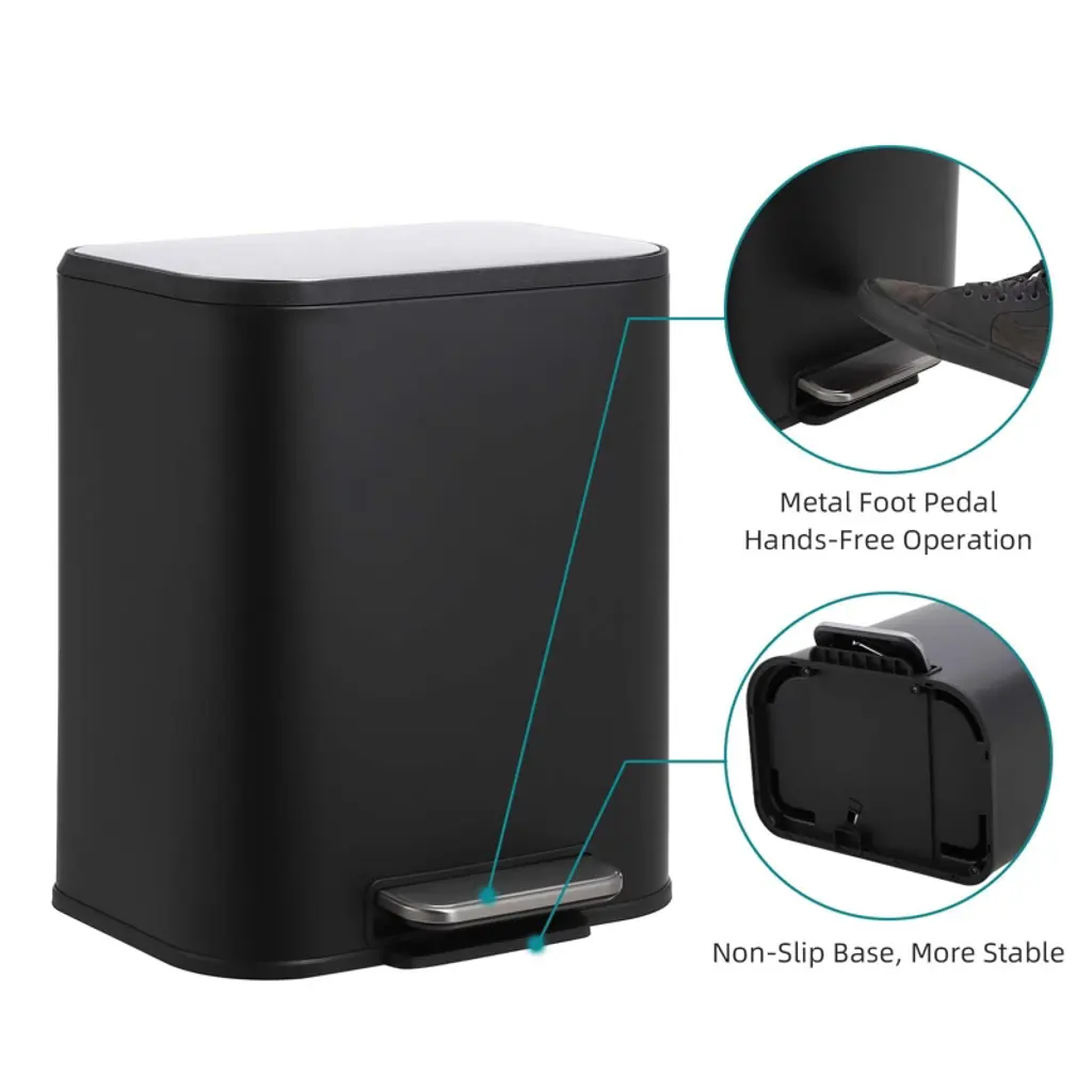 12L (3.2-gallon) black stainless steel trash can is crafted from high-quality material, boasting a smooth, easy-to-clean surface that retains its gloss and elegance while adding a sleek modern touch to any room. Designed for hands-free use, its step-on foot pedal enables effortless lid opening, allowing quick, hygienic waste disposal¡ªperfect for busy kitchens, offices, or living spaces. Equipped with a quiet soft-close lid and ergonomic metal pedals, it closes slowly to seal in odors, maintaining a fresh environment, and operates silently¡ªideal for homes, offices, or bathrooms. Lightweight and portable, it fits easily in kitchens, bedrooms, bathrooms, or living rooms, offering a space-saving solution. It includes a raised removable inner bucket with handles for simple, mess-free waste disposal and cleaning, enhancing user-friendliness. Dimensions: Overall size: 11.7 inches (length) ¡Á 9.3 inches (width) ¡Á 16.4 inches (height) Capacity: 12 liters (3.2 gallons) Material thickness: 0.4mm high-quality stainless steel Step pedal size: 4.2 inches ¡Á 2.8 inches Lid opening angle: 80 degrees Removable inner bucket: 10.9 inches (height) ¡Á 8.6 inches (diameter), with 1.5-inch handle height Distance from base to lid (closed): 16.4 inches What You Get: 1 black stainless steel trash can with brushed finish, 1 removable inner bucket with handles, user manual, 4 anti-slip rubber base pads, and a small pack of replacement screws. After-Sales Service: We provide detailed user manuals to guide setup and maintenance. If any parts are missing or damaged upon delivery, free replacements are arranged promptly. Our customer support team responds to inquiries within 24 hours, offering tips on cleaning the brushed surface, maintaining the soft-close lid, and using the step pedal effectively, ensuring a smooth experience.
