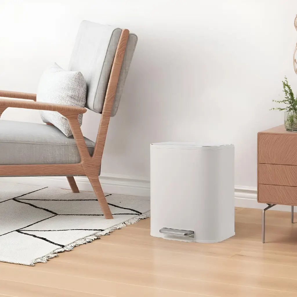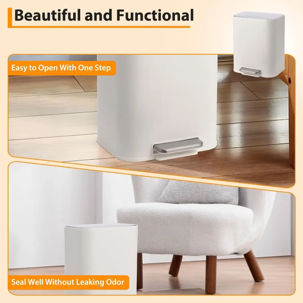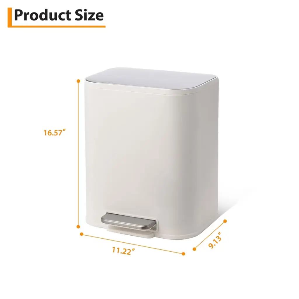 12L (3.2-gallon) white stainless steel trash can is crafted from high-quality, durable material, featuring a smooth, easy-to-clean surface that maintains its gloss and elegance¡ªmaking it a stylish addition to kitchens, living rooms, or bathrooms. Hands-free operation is enabled via a convenient step-on foot pedal, allowing quick, effortless lid opening¡ªideal for busy kitchens, offices, or homes to enhance sanitation and daily ease of use. Designed for quiet operation, it includes ergonomic metal pedals and a well-sealed soft-close lid that closes slowly, preventing unpleasant odors and creating a clean, comfortable environment suitable for multiple settings. Lightweight and portable, this compact rectangular trash can fits easily into kitchens, bedrooms, bathrooms, or offices, offering versatile, practical storage without occupying excessive space. It also comes with a removable raised inner bucket with convenient handles, simplifying waste disposal and cleaning to improve user-friendliness. Dimensions: Overall size: 11.8 inches (length) ¡Á 9.4 inches (width) ¡Á 16.5 inches (height) Capacity: 12 liters (3.2 gallons) Material thickness: 0.4mm high-quality stainless steel Step pedal size: 4.3 inches ¡Á 2.9 inches Lid opening angle: 80 degrees Removable inner bucket: 11 inches (height) ¡Á 8.7 inches (diameter), with 1.6-inch handle height Distance from base to lid (closed): 16.5 inches What You Get: 1 white stainless steel trash can with brushed finish, 1 removable raised inner bucket with handles, user manual, 4 anti-slip rubber base pads, and a small pack of replacement screws. After-Sales Service: We provide detailed user manuals to guide setup and maintenance. If any parts are missing or damaged upon delivery, free replacements are arranged promptly. Our customer support team responds to inquiries within 24 hours, offering tips on cleaning the brushed surface, maintaining the soft-close lid mechanism, and using the step pedal effectively, ensuring a hassle-free experience.