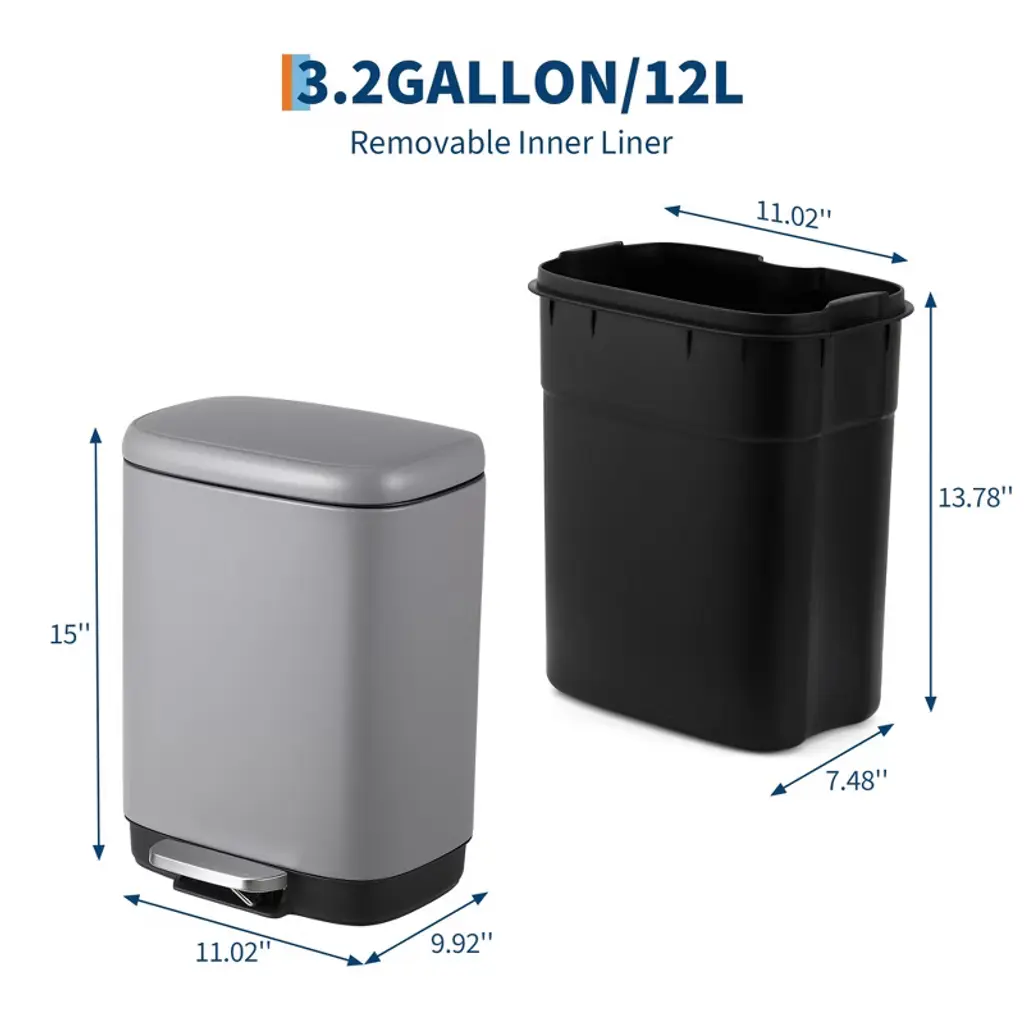 12L Bathroom Trash Can with Lid, Stainless Steel Kitchen Trash Can with Odor-Protective Lid | Hands-Free, with Foot Pedal and Trash Bag Ring, Removable Inner Bin, Suitable for Bathrooms