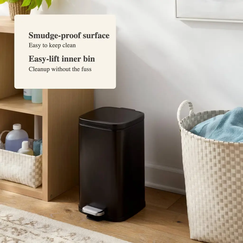 This 12-Liter Soft Square Stainless Step Trash Can from Brightroom™ brings easy waste disposal to your home office, laundry room or any other space. Made from stainless steel in black, this square trash can features a quiet-closing, pedal-operated lid for easy hands-free use. The can's fingerprint-resistant design keeps it looking like new for longer, and the removable liner helps you keep things neat.Brightroom™: See your space in a new light.