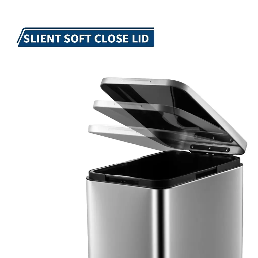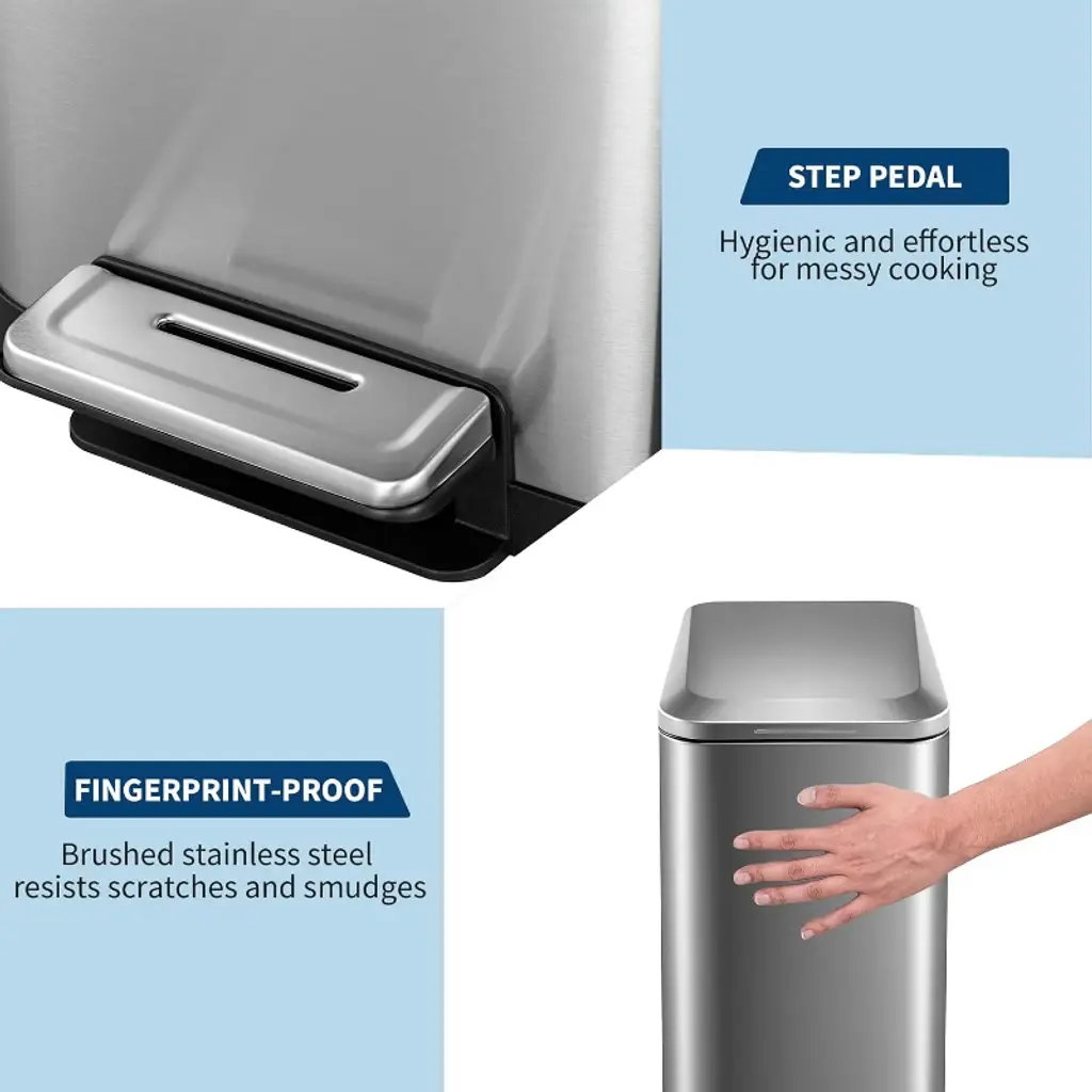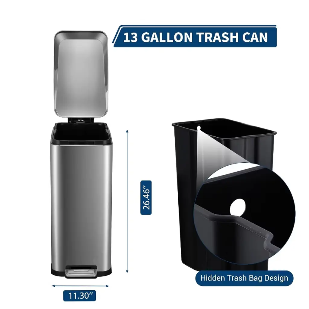 Simplify your waste disposal with our 13.2-gallon slim stainless steel kitchen trash can, featuring a hands-free step pedal, quiet soft-close lid, and a removable inner bucket for effortless cleaning in narrow spaces! Highlights at a Glance: Spacious 13.2-gallon capacity designed for daily waste disposal needs. Premium stainless steel construction with a fingerprint-proof surface for easy cleaning. Quiet soft-close lid with advanced slow-down technology for peaceful operation. Hands-free step pedal for convenient and hygienic waste disposal. Removable inner wastebasket for effortless cleaning and maintenance. Specification: Color: Silver, Black, White Material: Stainless Steel+Plastic Product Dimension: 11.3x20.8x26.5 Inches Capacity: 13.2 Gallon/50 L Packing List: 1×Trash Can 1×Inner bucket 1×Instruction Note: Before making a purchase, consider factors like height, width, depth and capacity to ensure the size of the trash can you are considering fits your need. To maintain appearance, regularly clean the surface of the trash can with a mild cleaner and soft cloth, avoiding the use of frosted materials to prevent scratching the stainless steel surface.