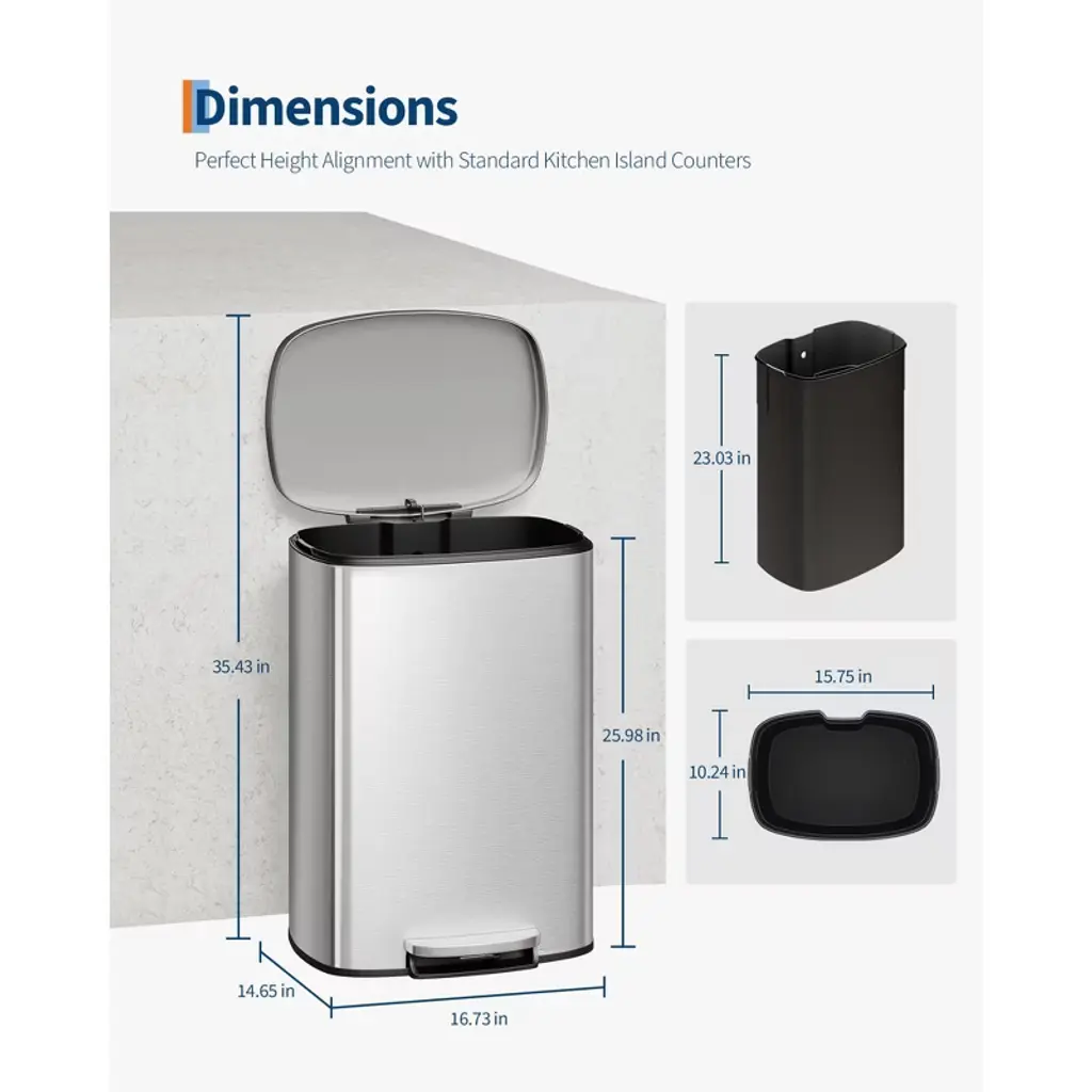 [SLEEK AESTHETIC, COMPACT FOOTPRINT] – The 13 gallon kitchen trash can features a slender silhouette at 16.73 in L × 14.65 in W × 25.98 in H when closed, extending to 35.43 in H at full lid opening—flawlessly aligning with standard 36 in island countertops. The removable inner bucket (15.75 in L × 10.24 in W × 23.03 in H) holds up to 32×16.9 oz water bottles or 70×12 oz cans, maximizing capacity without sacrificing floor space. [MINIMAL FORM, EXQUISITE DETAIL] – The stainless steel kitchen trash can boasts a fingerprint-resistant finish that wipes clean in seconds. The thick lid with extended overhang lip conceals bag edges for a seamless profile, while anti-slip rubber feet keep the bin firmly in place on tile, hardwood, or low-pile carpet. [HIGH-QUALITY MATERIALS] – The large trash can with lid is engineered for longevity. Its 410-grade ferritic stainless-steel shell resists rust and scratches while retaining lasting luster. The polypropylene inner buckets repel stains, odors. The thick ABS lid with stainless overlay withstands dents, stains, odors; the industrial-steel pedal endures 150,000+ steps, and the ABS hinge survives over 300,000 open/close cycles. [PRACTICAL DESIGN] – The tall step-on kitchen trash can prioritizes effortless operation. The ergonomic rear handle makes lifting and relocation a breeze. The soft-close lid glides open to 80° and locks at 95° for hands-free stay-open use. The inner bucket with lid traps odors, and the custom liner ring grips any standard bag to prevent slips, bunching, or overhang. [VERSATILE APPLICATIONS] – The trash bin adapts to every corner of your home: ideal for streamlining meal prep at kitchen islands; perfectly sized to nestle between cabinets and walls, in laundry rooms, coffee bars, or home offices; and seamlessly maintains a cohesive, high-end aesthetic.