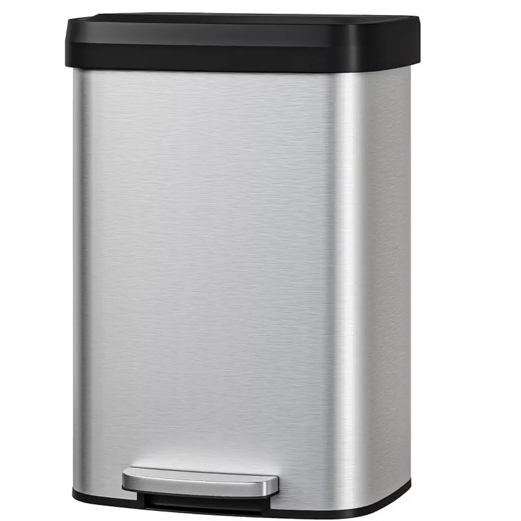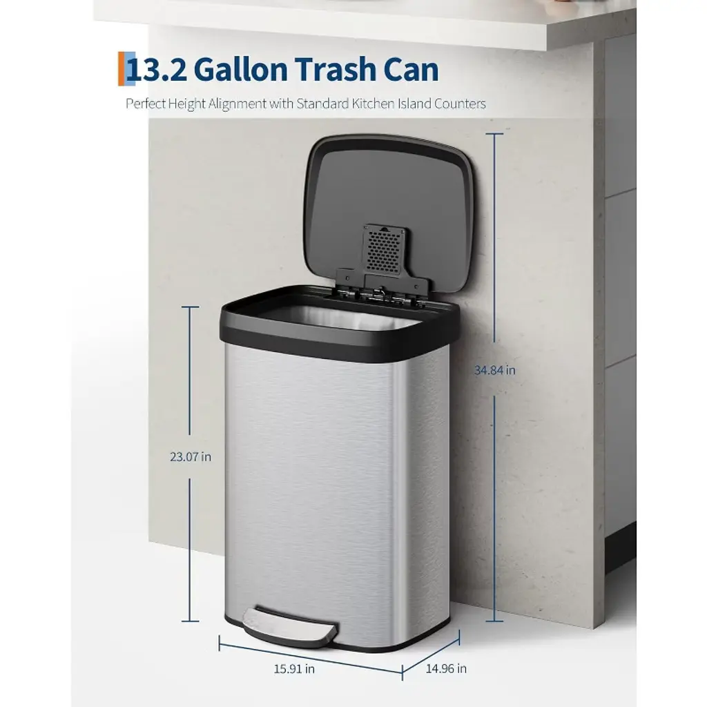 [SLEEK AESTHETIC, COMPACT FOOTPRINT] – The 13.2 gallon kitchen trash can presents a refined profile at 15.91 in L × 14.96 in W × 23.07 in H when closed and extends to 34.84 in H at full lid opening—flawless integration with a standard 36 in island countertop. Its bucketless interior holds up to 45×16.9-oz water bottles or 95×12-oz cans, maximizing capacity without wasting floor space. [MINIMAL FORM, EXQUISITE DETAIL] – The powder coated metal garbage can for kitchen features a fingerprint-resistant finish that stays smudge-free and wipes clean with a soft cloth. An integrated liner rim hides bag edges for a seamless silhouette, while anti-slip rubber feet keep the bin stable on tile, hardwood, or low-pile carpet. [HIGH-QUALITY MATERIALS] – The large trash can with lid is engineered for longevity. Its powder coated metal shell resists rust, scratches, and maintains lasting luster. A thick ABS lid stands up to dents, stains, odors; its industrial steel pedal endures 150,000+ steps and the one-piece ABS hinge survives over 300,000 open/close cycles. [PRACTICAL DESIGN] – Our tall step-on kitchen trash can prioritizes ease of use with an ergonomic rear handle for effortless lifting and relocation. The soft-close lid opens smoothly to 80° without hitting island edges and locks at 95° for hands-free cooking prep and scrap disposal. The integrated liner rim secures any standard bag snugly to prevent slips, bunching, or overhang. [VERSATILE APPLICATIONS] – The trash bin adapts to every corner of your home: ideal for streamlining meal prep at kitchen islands; perfectly sized to tuck into room corners, laundry rooms, coffee bars, and home offices to conceal clutter—all while maintaining a cohesive, high-end aesthetic.