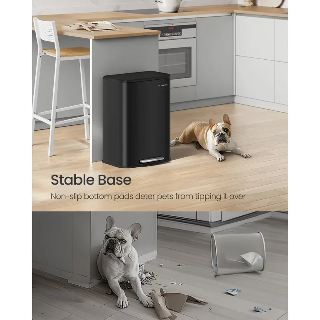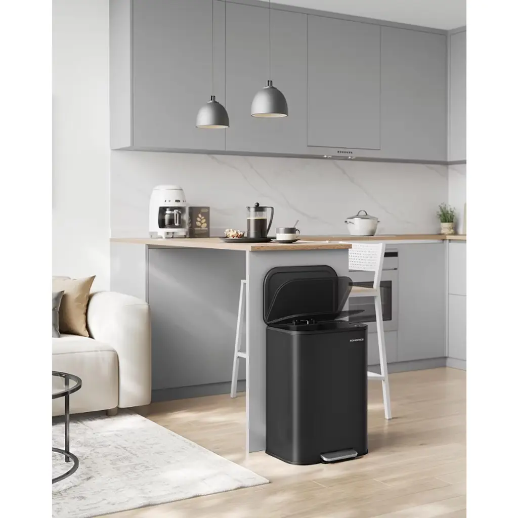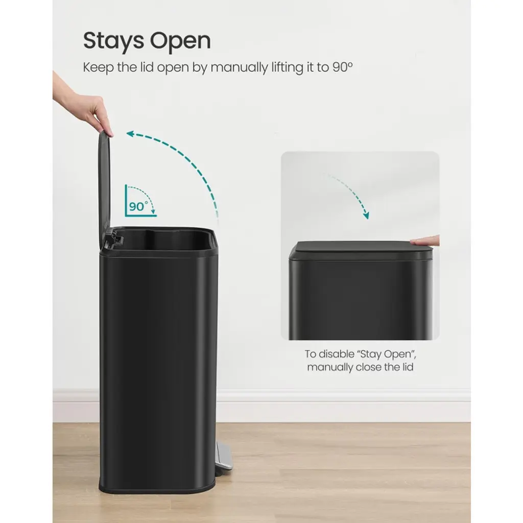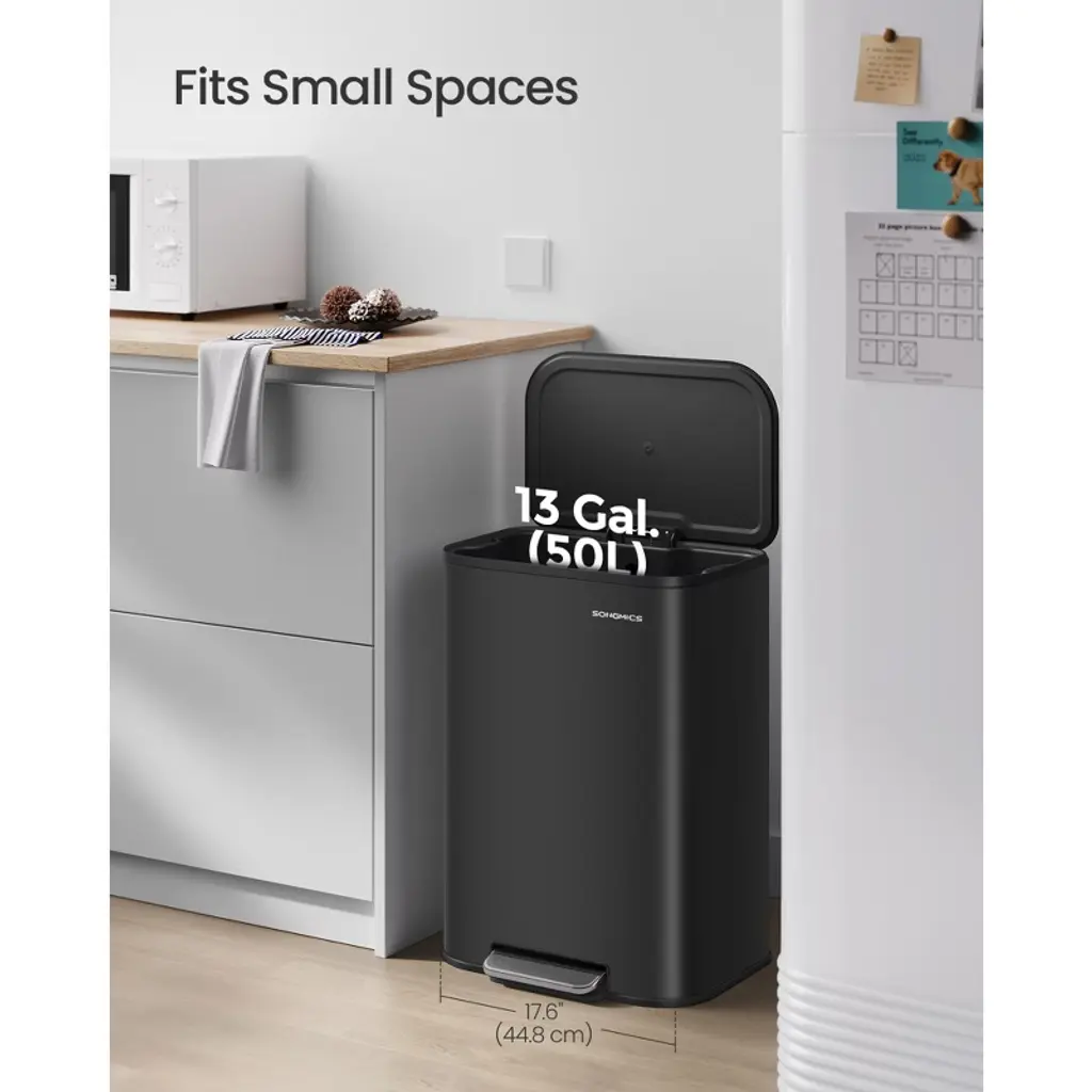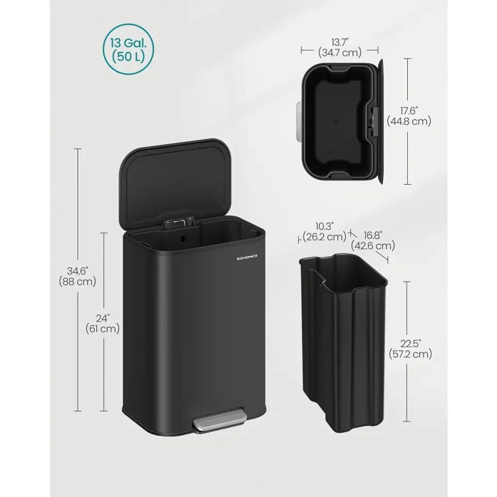 This premium 13-gallon (50L) stainless steel trash can combines sleek functionality with durable construction, featuring a hygienic inner bucket for easy liner changes and odor control. The innovative soft-close lid operates silently while offering a stay-open option for hands-free use, complemented by an extra-wide non-slip pedal for reliable foot operation. The fingerprint-resistant ink black finish maintains a polished look that blends with modern kitchens, while the heavy-duty 304 stainless steel body resists dents and corrosion. Measuring [insert dimensions], its space-efficient design includes a removable inner bucket for simplified cleaning and waste management. Material: Stainelss Steel, PP Plastic Product Size: 17.6¡±L x 13.7¡±W x 24¡±H (44.8 x 34.7 x 61 cm) Height with Lid Open: 34.6¡± (88 cm) Size of Inner Bucket: 16.8¡±L x 10.3¡±W x 22.5¡±H (42.6 x 26.2 x 57.2 cm) Volume: 13 Gal. (50 L) Product Weight: 14.8 lb (6.8 kg)