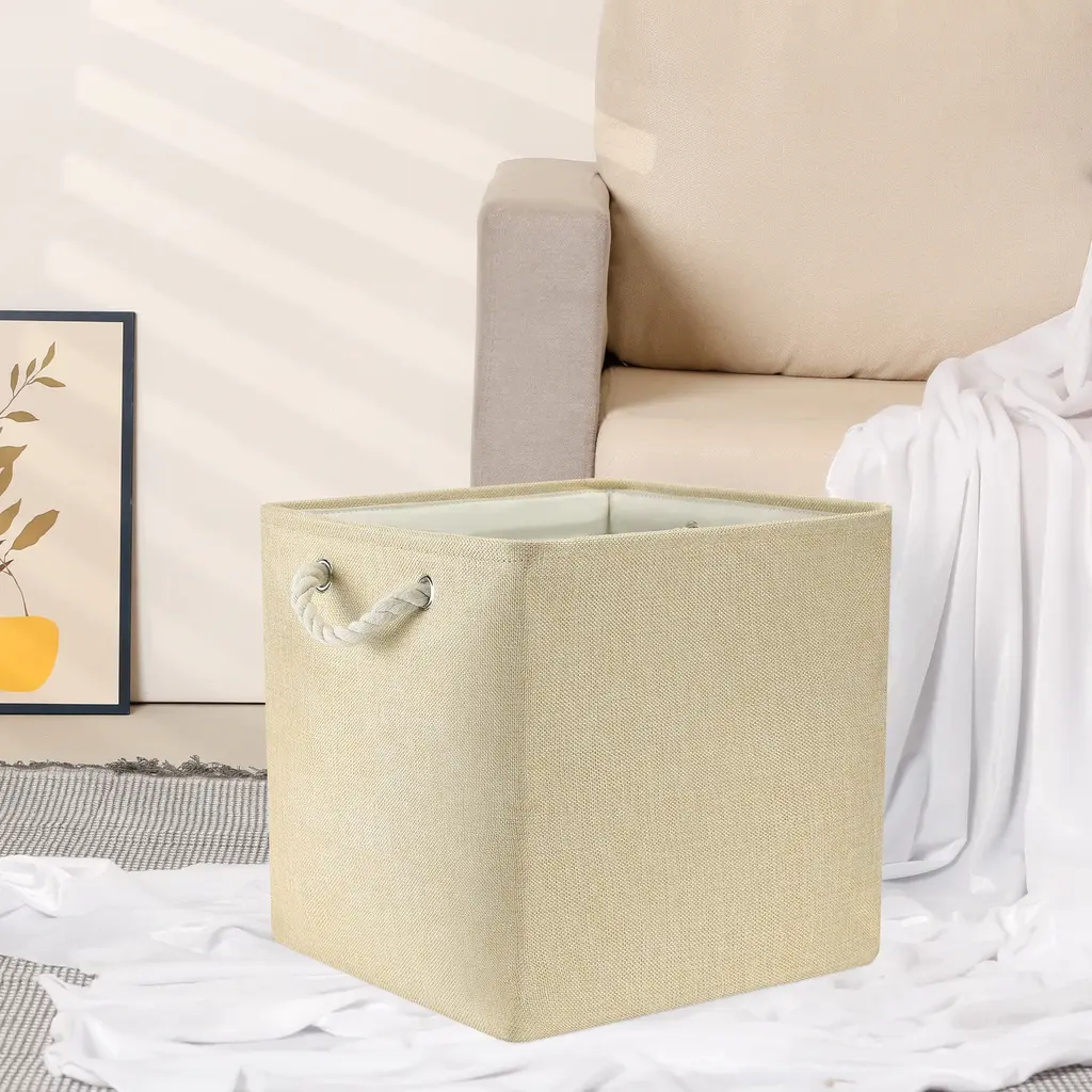 Premium Material: The cube storage organizer is made from good quality fabric and reinforced with a sturdy rope handle. The solid construction enables the shelf storage bins to stand upright without support, even when emptyCollapsible Design: The storage box can be folded flat when not in use to save space or transport. The large blanket basket for organizing various items, including clothing, towels, blankets, pet supplies, books, magazines, albums, DVDs, office and craft supplies, etcSpacious Capacity: Our organization bin enables you to store a wide variety of items to keep your home tidy and organizedEasy To Care: The large cube organizer is sturdy and has no odor and they are not machine washable. Lined with a thin linen fabric, linen closet organizer and storage is easy to clean, just wipe it with a damp sponge or clothVersatile Use Cubby Bin: Use the collapsible storage bin in the room, playroom, laundry area, closet, storage room, etc. Sit cube organizer bin on the floor, in the closet, bookcase, desk, shelving area, cubbies, and collage dorm room, classroom decor and towel organizerOur baskets provide attractive, lightweight solutions for all your storage and organization needs while keeping household items tidy and organized - Complete storage basket, closet organizers, nurseries, and more.These fabric storage bins are easy to carry or remove on a shelf. They could work well as drawers, open-top bins, or storage baskets for shelves.