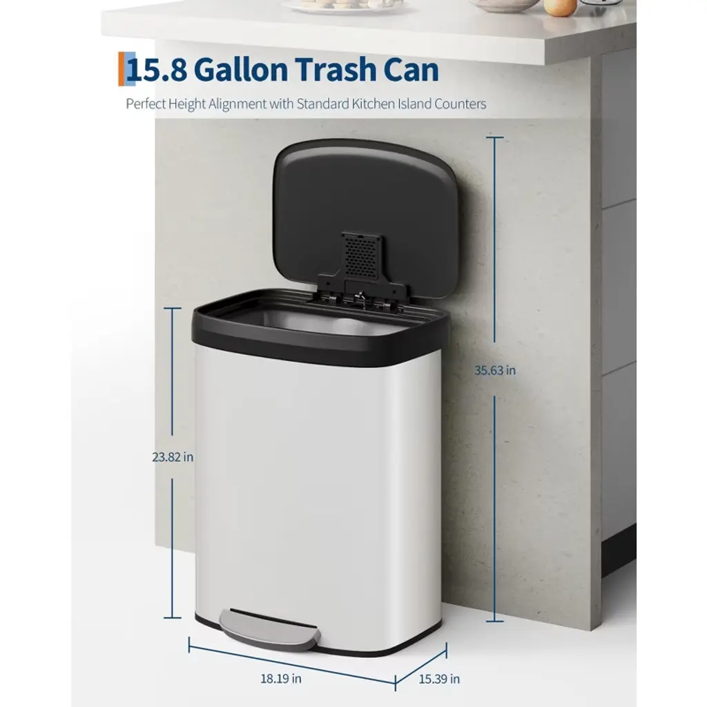 16 Gallon / 60 Liter Stainless Steel Trash Can With Lid, Large Garbage Can For Kitchen