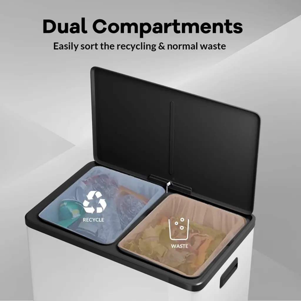 Product Description:This premium dual-compartment trash can offers an efficient waste management solution with its spacious 16-gallon (30L+30L) capacity. Designed for modern households and offices, it features two separate removable bins for easy waste sorting, a wide step pedal for hands-free operation, and a sleek stainless steel construction that resists fingerprints and odors.Key Features: Smart Waste Separation ¨C Dual 30L compartments (16-gallon total) for organized trash and recycling sorting Wide, Sturdy Pedal ¨C Extra-large step pedal ensures smooth, hands-free lid operation Quiet & Secure Closure ¨C Soft-close mechanism prevents loud slamming and accidental spills Premium Stainless Steel Build ¨C Durable, fingerprint-resistant surface with easy-wipe maintenance Removable Inner Buckets ¨C Two separate bins for hassle-free emptying and cleaning Odor & Pest Control ¨C Tight-sealing lid keeps smells contained and deters pestsSpecifications: Materials: Brushed stainless steel exterior + durable plastic inner buckets Lid Mechanism: Foot pedal with slow-close hinge Dimensions: [Include L ¡Á W ¡Á H if available] Weight Capacity: [Insert if available] per compartment Cleaning: Wipe-clean exterior; removable buckets are dishwasher-safeTotal Capacity: 16 gallons (30L + 30L)Ideal For: Offices requiring high-capacity, hygienic disposal Homes with pets or children seeking odor control Modern spaces desiring a sleek, functional designKitchens needing efficient waste & recycling separationThis high-capacity, dual-bin combines durability and smart functionality, making waste management clean, quiet, and effortless while enhancing any space with its sleek stainless steel finish.