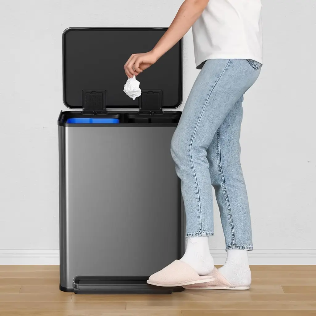 16 Gallon Kitchen Trash Can With Lid Foot Pedal and Inner Bucket,Fingerprint-Resistant Soft Close Lid Garbage Can Stainless Steel Dual Compartment Trash Can With Recycling Bin for Office Restaurant