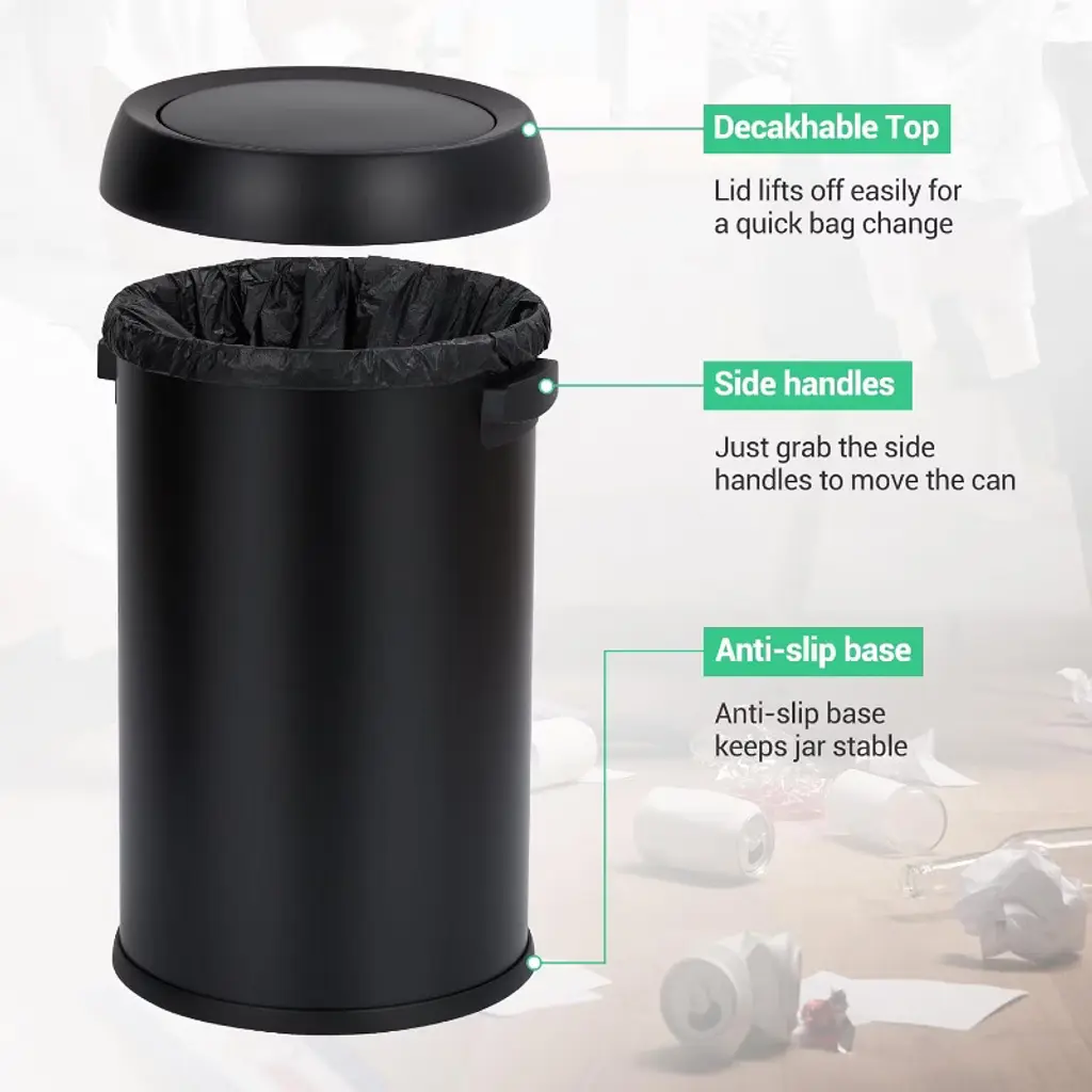 Upgrade your waste management with the 65 Liter/17 Gallon Swing Top Trash Can, the perfect solution for kitchens, outdoor spaces, homes, and offices. Crafted from fingerprint-proof stainless steel, this heavy-duty commercial round trash bin offers durability and a sleek, modern look that resists smudges and fingerprints, keeping it looking pristine with minimal effort. The swing lid design provides easy, hands-free operation, making disposal quick and hygienic, while effectively containing odors and preventing pests. Its spacious 65-liter capacity ensures fewer trips to empty, ideal for high-traffic areas or busy households. This open-top trash can is versatile, suitable for use as a rubbish bin, garbage and recycling can, or a commercial waste container, making it an essential addition to any space. Its sturdy construction and commercial-grade quality ensure long-lasting performance, even in demanding environments. Whether you need a reliable outdoor trash bin, a stylish kitchen companion, or a durable office waste container, the Swing Top Trash Can combines functionality with sleek design to meet all your waste disposal needs. Easy to clean and maintain, this stainless steel garbage can is the ultimate choice for those seeking a professional-grade, fingerprint-proof, and user-friendly trash solution.