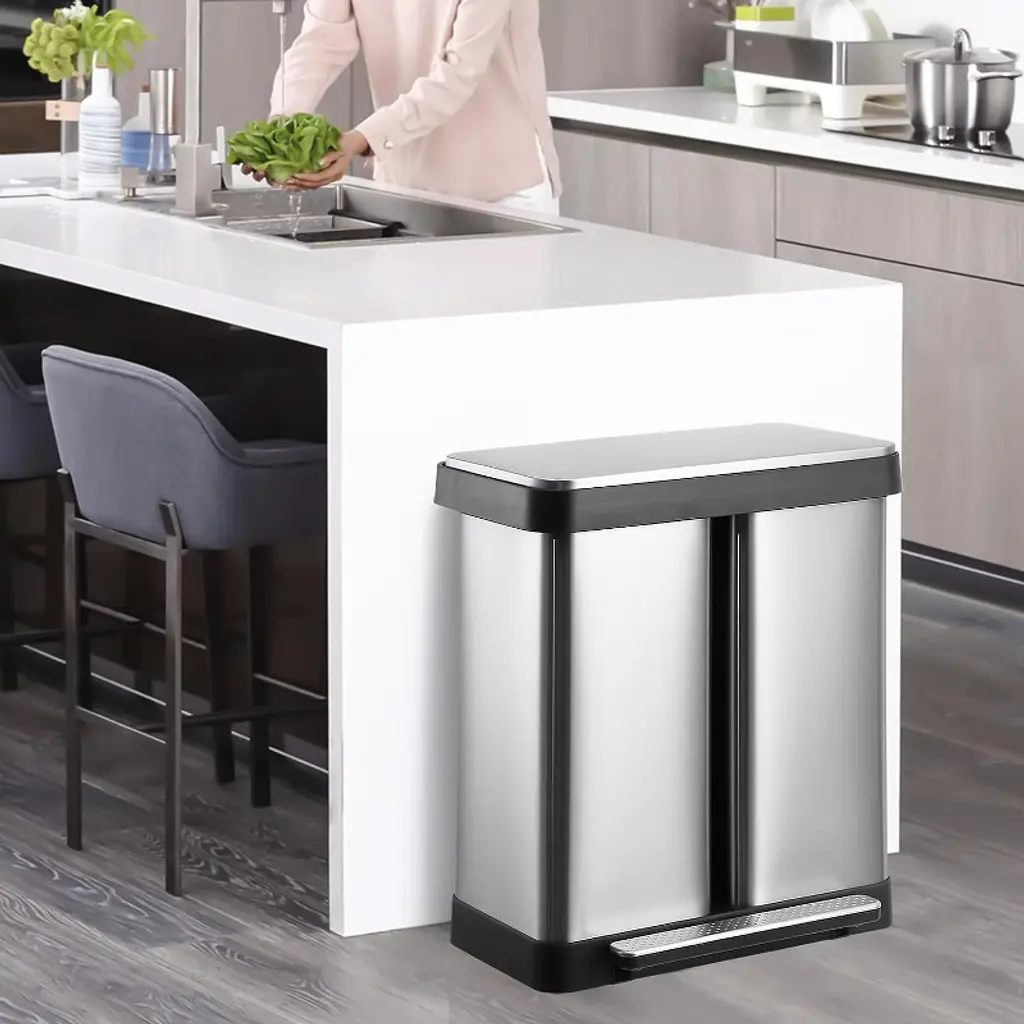 19 Gallon Dual Trash Can, Two Compartment Trash Can, Trash Can with Recycling Bin Combo, Double Garbage Cans for Kitchen, 2 X 9.5 Gallons, Stainless Steel