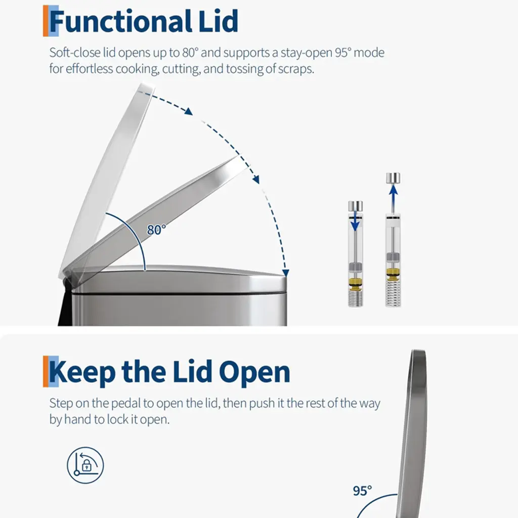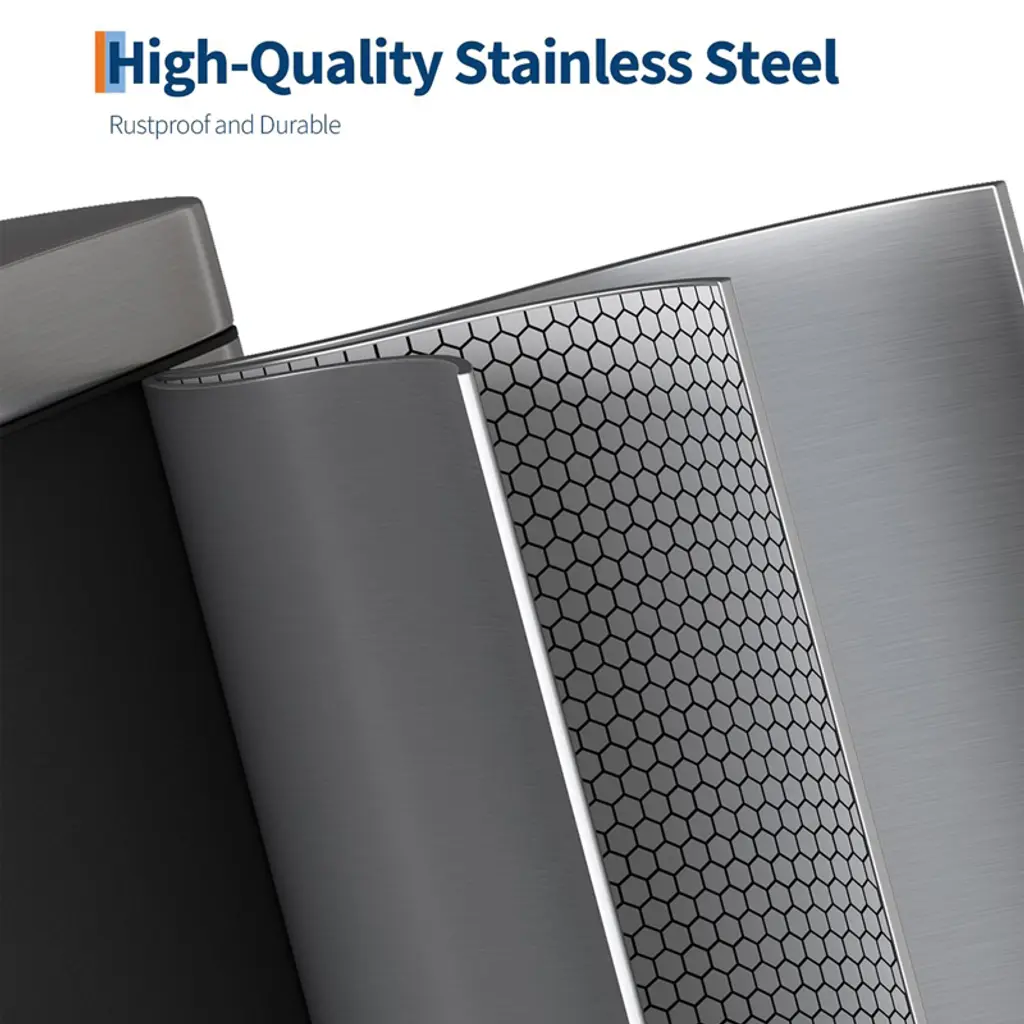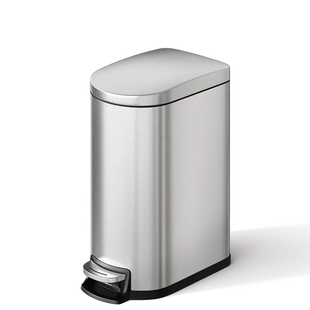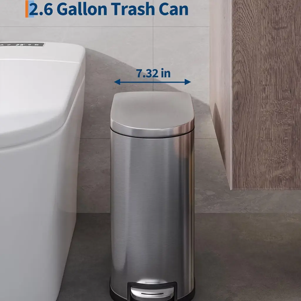 [SLEEK AESTHETIC, COMPACT FOOTPRINT] ¨C The 2.6 gallon bathroom trash can presents a sleek silhouette at 12.6 in L ¡Á 7.32 in W ¡Á 15.28 in H when closed, rising to 25.59 in H on lid opening¡ªeffortlessly fitting into narrow bathroom gaps. The removable inner bucket (9.84 in L ¡Á 6.58 in W ¡Á 13.98 in H) holds up to 6¡Á16.9 oz bottles or 15¡Á12 oz cans, maximizing volume without sacrificing floor space [MINIMAL FORM, EXQUISITE DETAIL] ¨C The stainless steel garbage can for bathroom features a fingerprint-resistant finish that wipes spotless with a soft cloth. A thick lid with extended overhang lip hides bag rims for a flawless profile, while anti-slip rubber feet anchor the bin securely on bathroom or bedroom floors. Inner-bucket lips enable touch-free removal and replacement of liners, ensuring clean bag changes every time [HIGH-QUALITY MATERIALS] ¨C The small trash can with lid is built to endure. Its 410 Garade ferritic stainless-steel shell delivers rustproof, waterproof strength and lasting luster, while the polypropylene inner bucket repels stains, odors. A durable ABS lid with stainless overlay resists dents; the industrial-steel pedal withstands 150,000+ steps; and the heavy-duty ABS hinge survives over 300,000 open/close cycles [PRACTICAL DESIGN] ¨C The 's slim step-on bathroom trash can prioritizes ergonomic ease. Its rear handle enables effortless lifting and relocation. The soft-close lid glides open to 80¡ã and locks at 95¡ã for hands-free stay-open mode. The inner bucket with lid traps odors, and a custom liner ring secures any standard bag snugly to prevent slips, bunching, or overhang [VERSATILE APPLICATIONS] ¨C The trash bin adapts to every corner of your home: perfect for the gap between toilet and sink or beside the tub; slides into tight spaces between cabinets, walls, or appliances; and elevates your home coffee corner with polished, clutter-free functionality [STURDY PACKAGING] ¨C The garbage bin ships in reinforced five-ply (K5), 200 LB corrugated cartons, complete with protective corner guards and custom molded foam inserts to guard against dents, dings, or crushing during transit [1-YEAR WARRANTY & SUPPORT] ¨C We cover shipping damage, parts failure under normal use, and any functional issues for one full year. Simply reach out to our customer service team at any time for assistance or replacement