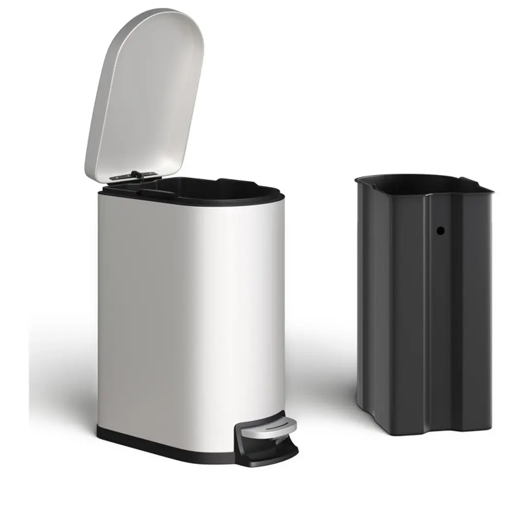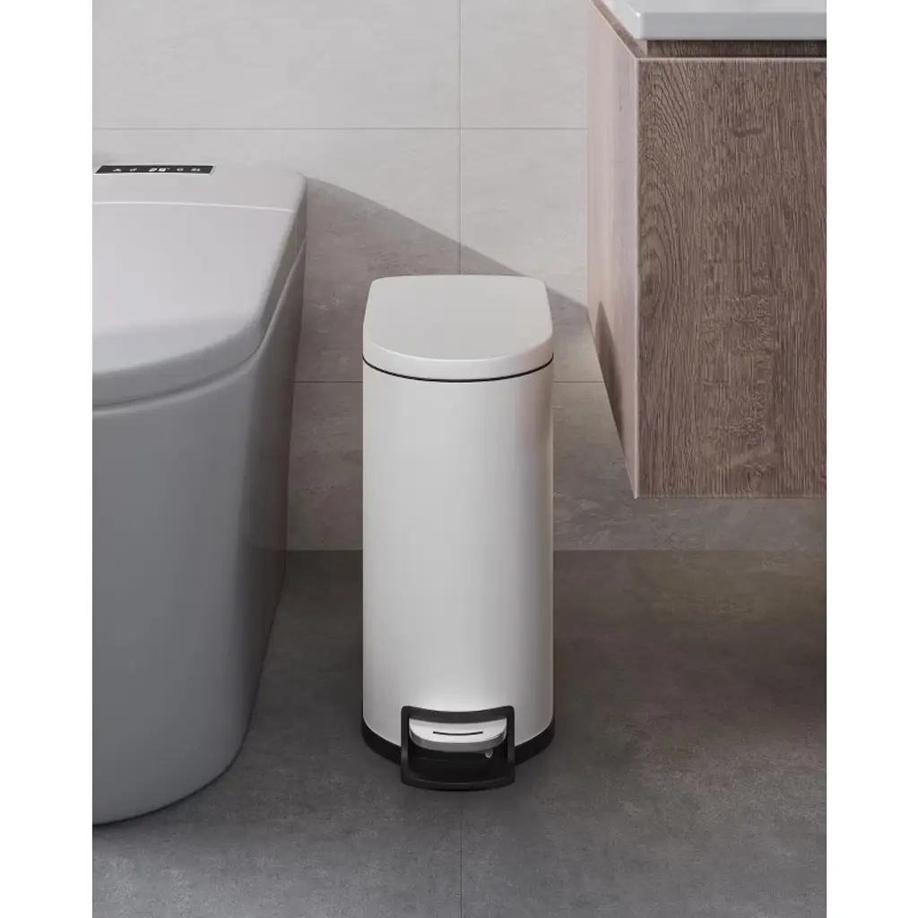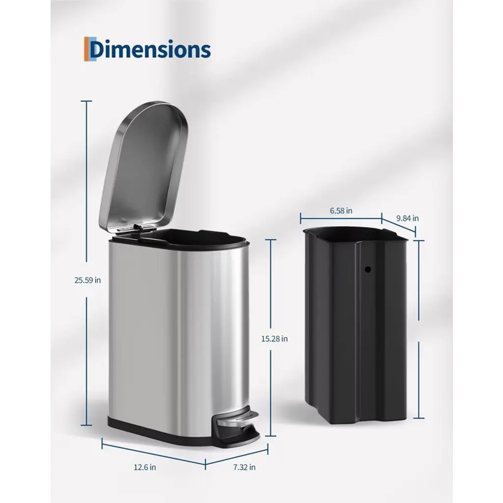 The 2.6-gallon bathroom trash bin boasts a slim profile (12.6" L × 7.32" W × 15.28" H closed, extending to 25.59" H with the lid open), making it perfect for fitting into narrow spaces. The removable inner bucket (9.84" L × 6.58" W × 13.98" H) maximizes capacity—holding up to six 16.9 oz bottles or fifteen 12 oz cans—with minimal floor space required. Crafted from stainless steel with a fingerprint-resistant surface, this garbage can cleans easily with just a wipe. Its thick lid features an overhanging lip to conceal bag edges, while anti-skid rubber feet keep it firmly in place. The inner bucket features handy grips for mess-free liner changes, ensuring a neat and tidy appearance at all times.