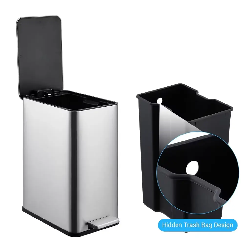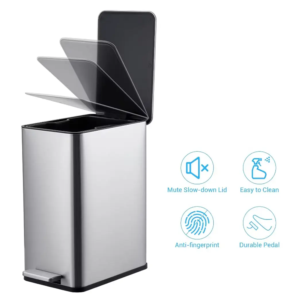 Space-Saving Design: Measuring 7.48 x 13.11 x 15 inches, this stainless steel rubbish bin maximizes vertical space with a generous 2.6-gallon capacity, effectively holding waste while occupying minimal floor space, making it ideal for smaller areas. Premium Stainless Steel Construction: The bathroom trash can, made from high-grade stainless steel for rust resistance and longevity, features a fingerprint-proof surface and wear protection, making it a stylish addition to any dining room or bathroom. Convenient Removable Inner Bucket: This step trash can features a removable inner bucket for easy emptying and cleaning, allowing you to simply lift out the wastebasket, dispose of the garbage, and be done without any hassle. Soft-Close Lid for Noise Reduction: Equipped with a soft-close lid, this waste bin operates quietly to eliminate the loud clatter of traditional bins and prevents slamming, making it ideal for quiet environments or homes with young children. Hands-Free Operation with Foot Pedal: This garbage can features a foot pedal for hands-free operation, allowing you to open the lid for easy disposal without touching the bin, making it a hygienic choice for kitchens and bathrooms.