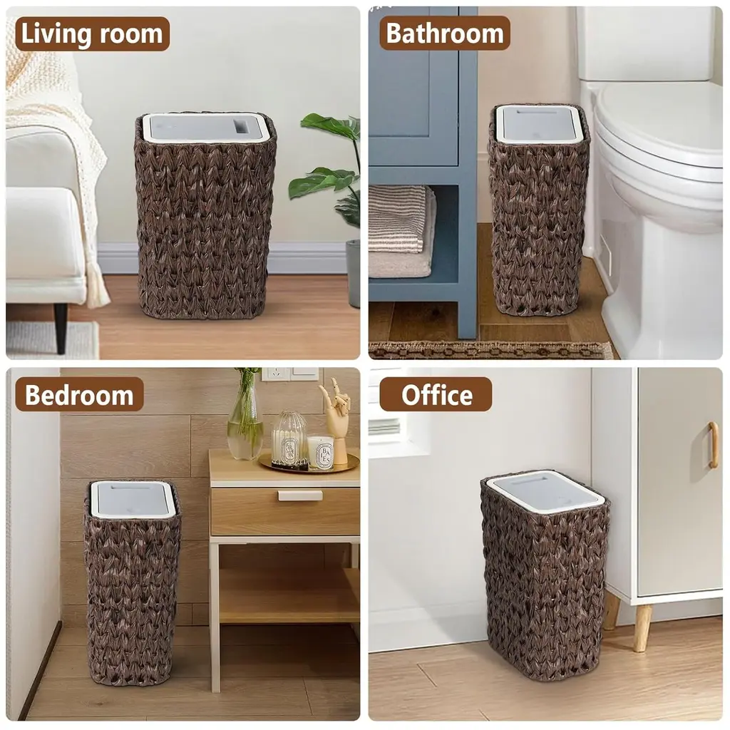 This small bathroom trash can is neat and tidy. Clean lines and smooth surfaces of diaper trash can make it easy to keep clean and maintain. Under sink trash can traps garbage smells inside, so your space smells fresh and clean all the time. With this pop up trash can with lid, you can say goodbye to unsightly messes and unpleasant odors!Features: ✅ 【Maximize Your Space】Our slim and narrow bathroom trash can is designed to fit into tight spaces, Measuring 9.6*7.0*13.6 inches,for tight spaces such as bathrooms, bedrooms, or small kitchens. Slim profile of mini trash can allows small bedroom trash can to fit in narrow areas, while contemporary design of compost bin and wicker style adds a touch of style to any room. ✅ 【Waste Basket and Laundry Hamper 2 in1】Whether you need a small bin for your bathroom, bedroom, or office, our 2.6-gallon wastebasket is a perfect choice. you can disassemble it into a rattan laundry hamper and kitchen trash can at any time, The combination of multiple functions can meet your needs in all aspects. ✅ 【Dog Proof Pop-up Lid Trash Can】Effortless Press-up Lid - Enjoy the convenience of our small trash can with its innovative pop-up lid. Need press the lid to open or close it, This feature of slim bathroom garbage can is especially helpful for households with curious pets that tend to knock over or rummage through dog proof trash can.
