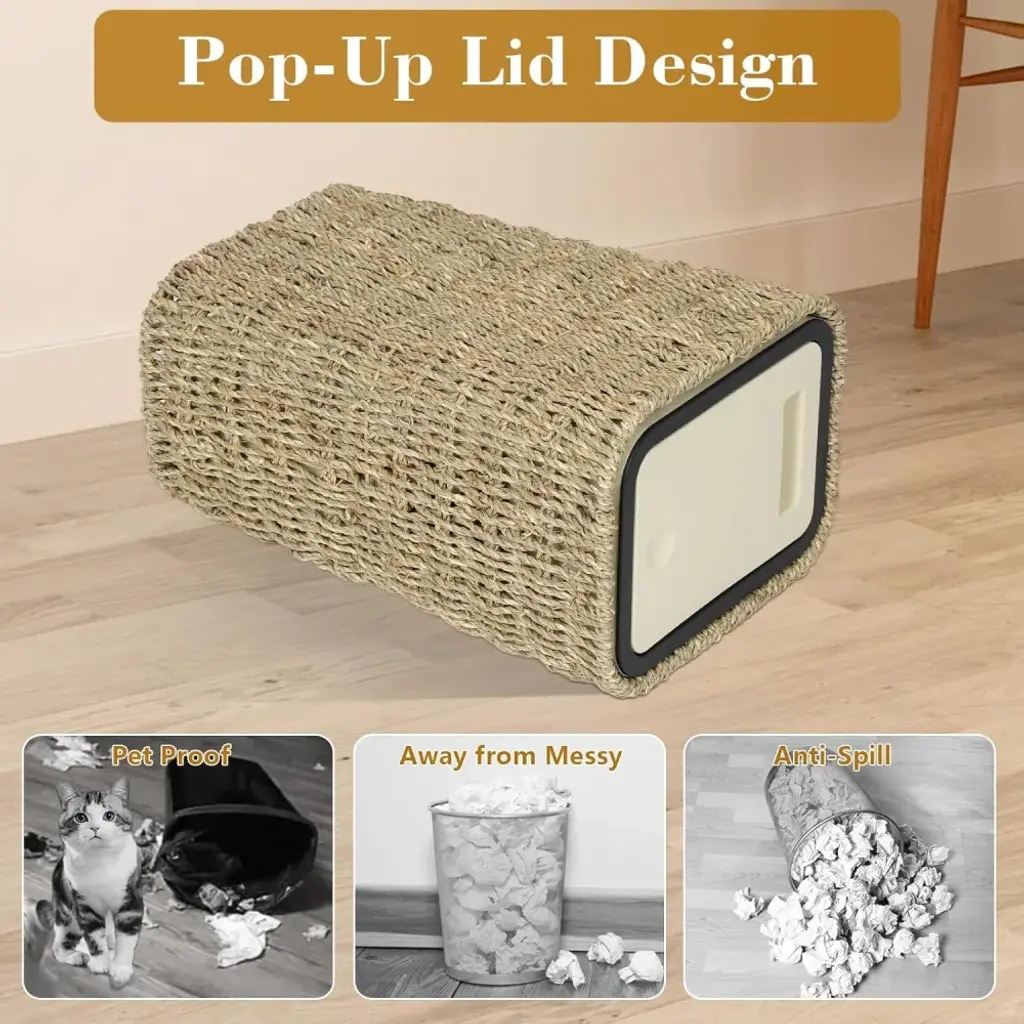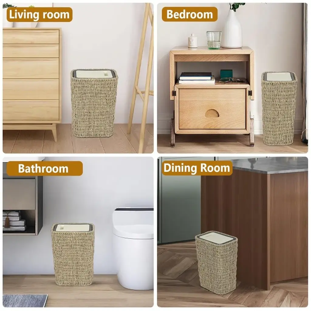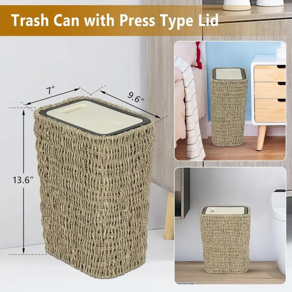 Our slim and narrow 3-pack bathroom trash can is designed to fit into tight spaces, Measuring 9.6*7.0*13.6 inches,for tight spaces such as bathrooms, bedrooms, or small kitchens. Slim profile of mini trash can allows small bedroom trash can to fit in narrow areas, while contemporary design of compost bin and wicker style adds a touch of style to any room.Features: ✅ 【Superior Odor Control 】This wicker basket is neat and tidy. Clean lines and smooth surfaces of diaper trash can make it easy to keep clean and maintain. Under sink trash can traps garbage smells inside, so your space smells fresh and clean all the time. With this pop up trash can with lid, you can say goodbye to unsightly messes and unpleasant odors! ✅ 【Waste Basket and Laundry Hamper 2 in1】Whether you need a small bin for your bathroom, bedroom, or office, our 3-gallon wastebasket is a perfect choice. you can disassemble it into a rattan laundry hamper and kitchen trash can at any time, The combination of multiple functions can meet your needs in all aspects. ✅ 【Dog Proof Pop-up Lid Trash Can】Effortless Press-up Lid - Enjoy the convenience of our small trash can with its innovative pop-up lid. Need press the lid to open or close it, This feature of slim bathroom garbage can is especially helpful for households with curious pets that tend to knock over or rummage through dog proof trash can.