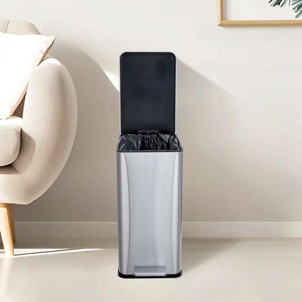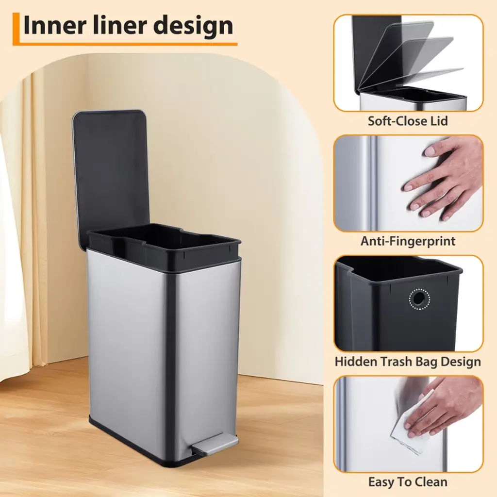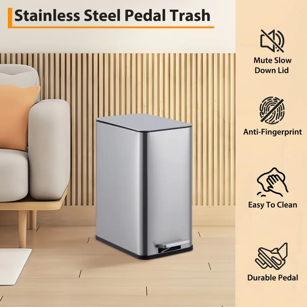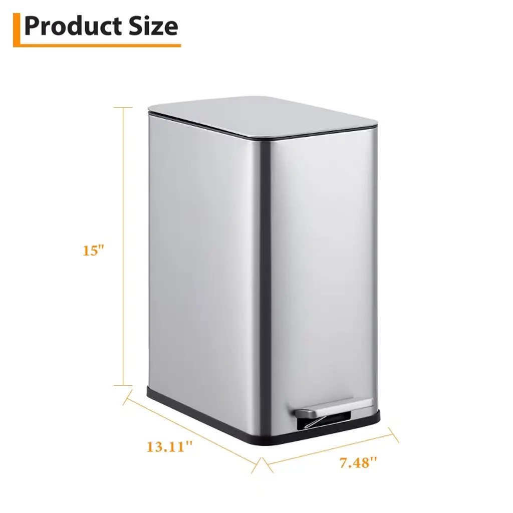 Elevate your waste disposal with our 2.64-gallon stainless steel kitchen trash can, featuring a quiet soft-close lid, hands-free step operation, and a removable inner bucket—perfect for stylish and convenient recycling in tight spaces!Highlights at a Glance:Sturdy stainless steel construction for long-lasting use.Quiet soft-close lid for a peaceful kitchen environment.Hands-free pedal operation for convenient waste disposal.Removable inner wastebasket for easy cleaning and emptying.Slim design perfect for tight spaces in kitchens or bathrooms.Specification:Material: Stainless SteelProduct Dimension: 13.11x7.48x15.00 InchesCapacity: 2.64 Gallon/10 LPacking List:1×Trash Can1×Inner bucket1×InstructionNote:Before making a purchase, consider factors like height, width, depth and capacity to ensure the size of the trash can you are considering fits your need.To maintain appearance, regularly clean the surface of the trash can with a mild cleaner and soft cloth, avoiding the use of frosted materials to prevent scratching the stainless steel surface.