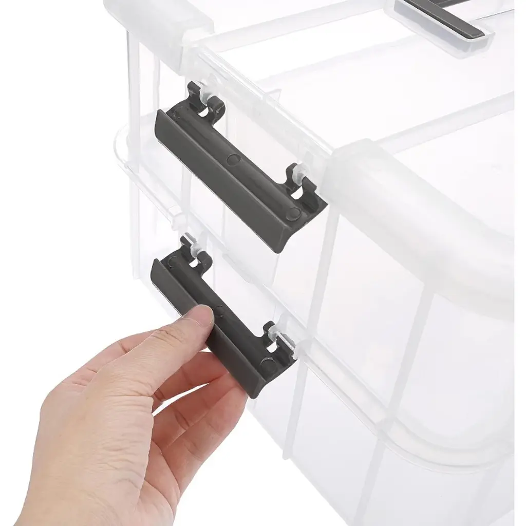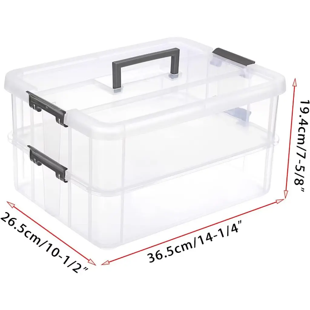 Plastic Stack carry box is 2 tiers with handle for best use of space, buckle latches is detachable, we could use it to lock your supplies for safe storage, or use the layer independently to fit individual needs. Storage box has a carry handle on the top so you can latch the two boxes together and move them around all at once. Storage container with transparent design, you can clearly see what is in the box easily and find where they are stored, eliminating the hassle of opening the box. Overall dimension is about 14-1/4" x 10-1/2" x 7-5/8". Light weight and easy to transport and carry. Perfect for collecting all small things, such as bobbins, small toys, beads, jewelry, beauty products accessories, scrapbooking supplies, sewing supplies, art supplies, nail polish and so on.