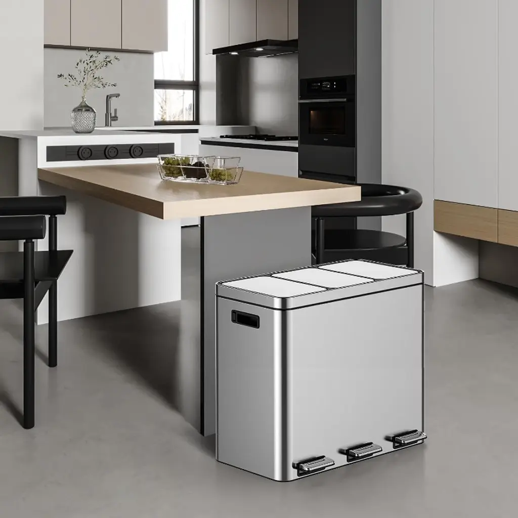 Ample Capacity: Dimension: With a total capacity, this trash can provides ample space for both trash and recycling including interior plastic liner bins, allowing for efficient waste storage and disposal. Solid and Long-lived: Crafted from stainless steel, this rubbish bin effectively solves the problem of rust, making the garbage can long-lived. By using slow down technology can reduce trash can damage, ensuring that there is no loud slamming noise when closing. Odor-Sealing Design: Designed with an odor-sealing ensuring the lid securely seals around the rim, preventing the odors escape from the trash can, effectively minimizing odor leakage and maintains a more hygienic environment. Hands-Free Opening: The kitchen trash can features a solid foot pedal allowing you to open the lid easily without the need to bend down, also reducing the need for contact with the lid, providing you with a more hygienic way to dispose of rubbish. Removable Bucket Liner: The recycling bin features a removable bucket liner with a carrying handle on each inner bucket, allowing for easy removal of the inner bucket by simply pulling it out, making it convenient for emptying or replacing the garbage bag.
