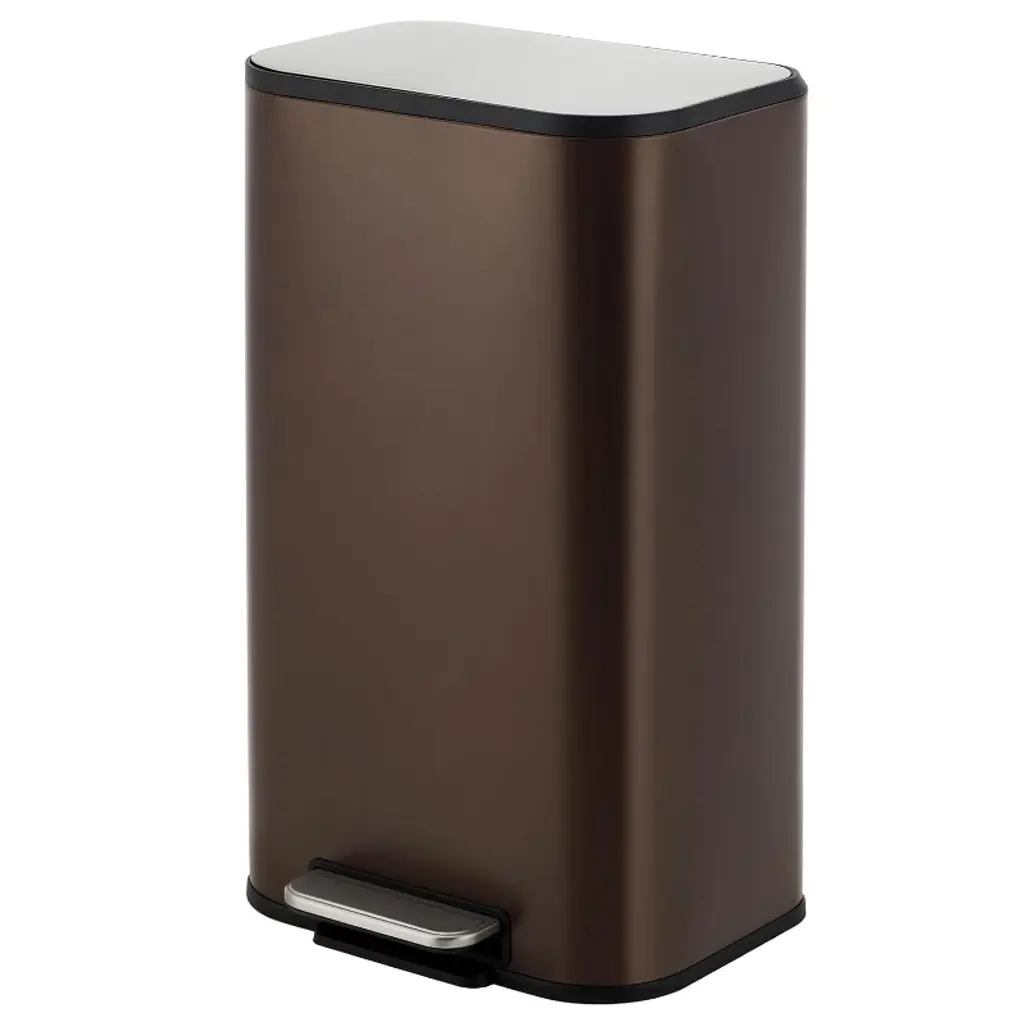 Elevate your daily routine with this quiet-close step-on trash can. Its slim rectangular design and thoughtful features make it an ideal choice for your kitchen, bathroom, or office.【Details】The narrow profile fits snugly into tight corners, maximizing space efficiency. The hands-free foot pedal ensures hygienic use, even with messy hands. An integrated bag ring keeps liners securely in place.The lid closes slowly and silently, maintaining a peaceful environment. The polished, fingerprint-resistant finish wipes clean easily, maintaining a sleek look with minimal effort.Combining minimalist aesthetics with robust functionality, this bin is a smart upgrade for a more streamlined and tidy space.