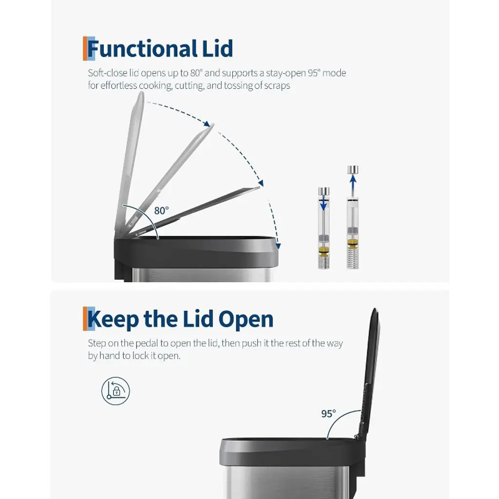 [SLEEK AESTHETIC, COMPACT FOOTPRINT] – The 21.1 gallon kitchen trash can presents a refined profile at 18.19 in L × 15.39 in W × 28.23 in H when closed and extends to 39.96 in H at full lid opening—just 3.96 in above a standard 36 in island countertop for flawless integration. Its bucketless interior holds up to 80×16.9-oz water bottles or 140×12-oz cans, maximizing capacity without wasting floor space. [MINIMAL FORM, EXQUISITE DETAIL] – The powder coated metal garbage can for kitchen features a fingerprint-resistant finish that stays smudge-free and wipes clean with a soft cloth. An integrated liner rim hides bag edges for a seamless silhouette, while anti-slip rubber feet keep the bin stable on tile, hardwood, or low-pile carpet. [HIGH-QUALITY MATERIALS] – The large trash can with lid is engineered for longevity. Its powder coated metal shell resists rust, scratches, and maintains lasting luster. A thick ABS lid stands up to dents, stains, odors; its industrial steel pedal endures 150,000+ steps and the one-piece ABS hinge survives over 300,000 open/close cycles. [PRACTICAL DESIGN] – Our tall step-on kitchen trash can prioritizes ease of use with an ergonomic rear handle for effortless lifting and relocation. The soft-close lid opens smoothly to 80° without hitting island edges and locks at 95° for hands-free cooking prep and scrap disposal. The integrated liner rim secures any standard bag snugly to prevent slips, bunching, or overhang. [VERSATILE APPLICATIONS] – The trash bin adapts to every corner of your home: ideal for streamlining meal prep at kitchen islands; perfectly sized to tuck into room corners, laundry rooms, coffee bars, and home offices to conceal clutter—all while maintaining a cohesive, high-end aesthetic.