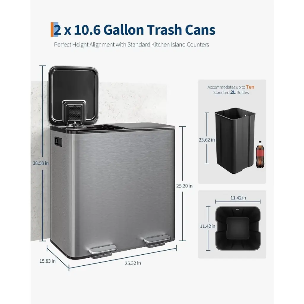 2X10.6 Gallon Dual Compartment Kitchen Trash Cans, Stainless Steel Step Trash Can With Soft-close Lid & Removable Inner Bucket For Kitchen, Grey