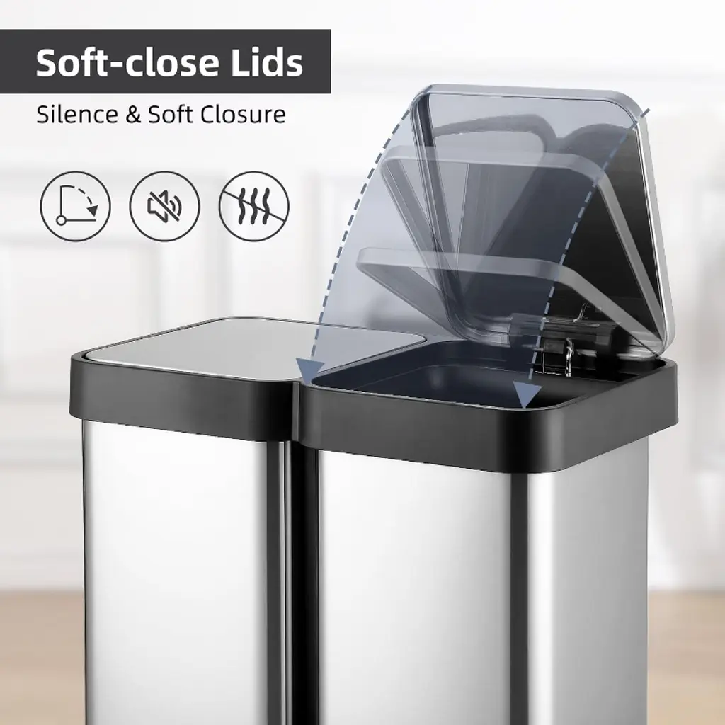 Material and Build: Crafted from high-quality fingerprint-resistant stainless steel, this kitchen trash can offers durability and a sleek, modern appearance. The sturdy construction ensures long-lasting use while maintaining a clean and polished look. Features and Benefits: Designed with two soft-close lids, this trash can minimizes noise and prevents lid slamming, providing a quieter and more pleasant environment. The dual compartments allow for efficient waste separation, making recycling and trash disposal more convenient and environmentally friendly. The fingerprint-resistant surface keeps the exterior looking clean and smudge-free, reducing the need for frequent cleaning. Design and Aesthetics: The sleek, rectangular shape and stainless steel finish give this trash can a contemporary and professional look that fits seamlessly into kitchens, offices, and bathrooms. Its compact design maximizes space without sacrificing capacity. Additional Functionalities: This model does not include inner buckets, which allows for easy placement of trash bags and simplifies cleaning. The dual compartments are perfect for sorting recyclables and general waste, promoting better waste management practices. Notes and Disclaimers: Please note that this trash can does not come with inner buckets. Colors may vary slightly due to different display settings.