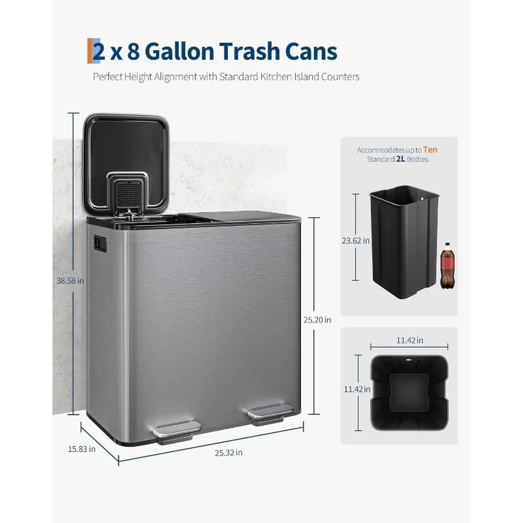 2X8 Gallon Dual Compartment Kitchen Trash Cans, Stainless Steel Step Trash Can With Soft-close Lid & Removable Inner Bucket For Kitchen, Grey