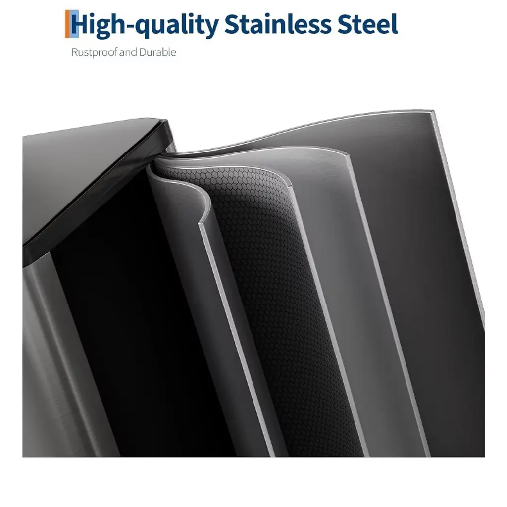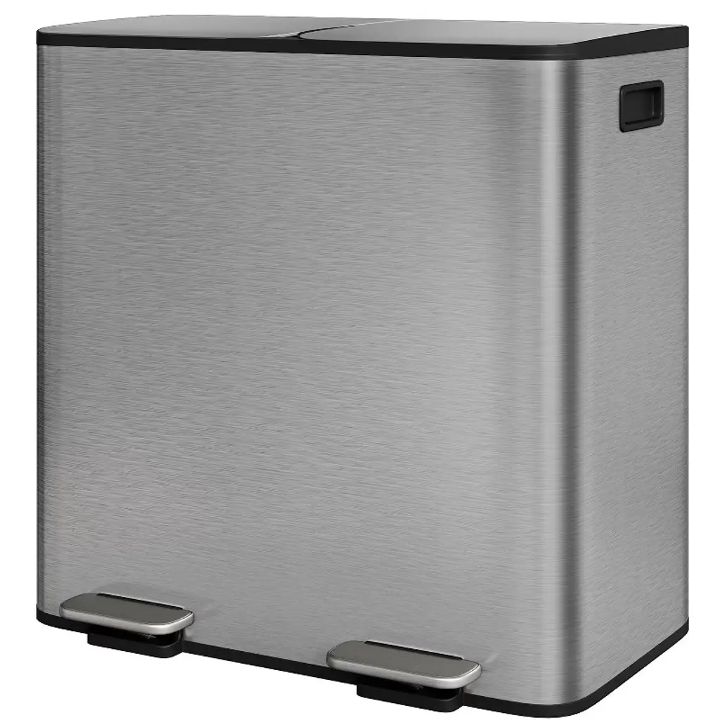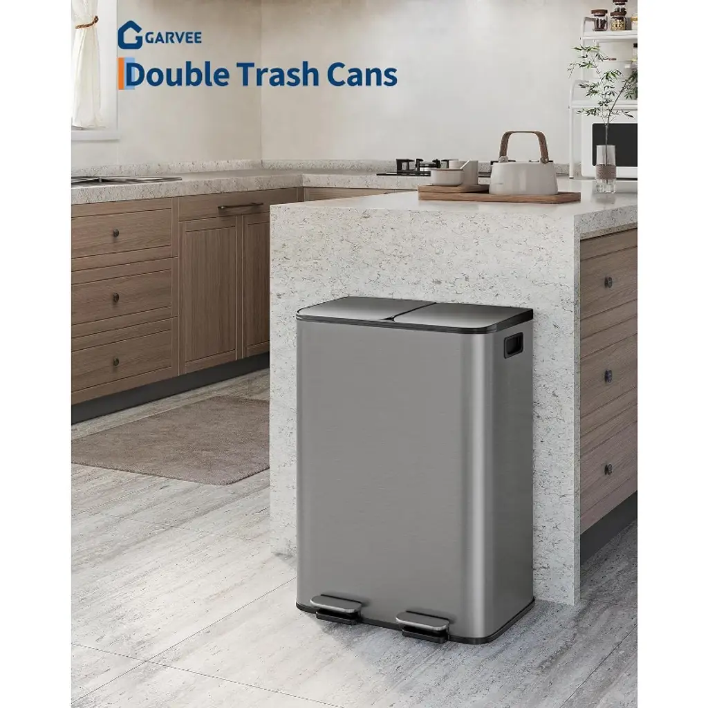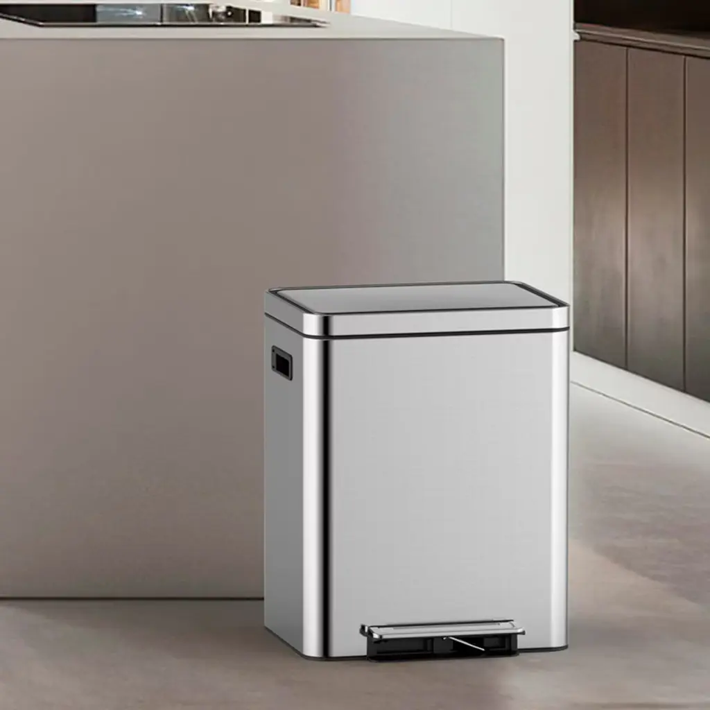 Efficient Dual Compartment Design: This dual trash can features two separate compartments, making it easy to sort waste and recyclables. Perfect for homes, dining rooms, or restaurants seeking cleaner, more organized waste management. Soft-Close & Stay-Open Lid: The step trash can is equipped with a soft-close lid that opens up to 80° for quiet use and can be locked at a 95° angle for hands-free access during cooking or cleaning—making waste disposal effortless and mess-free. Easy-Clean Removable Buckets: Each side features a removable inner bucket for hassle-free cleaning and emptying. Simply lift out the buckets to dispose of trash or recyclables and keep your garbage bin fresh and tidy. Durable Stainless Steel Build: Crafted from premium rust-resistant stainless steel, this rectangle garbage can is built to last. The fingerprint-resistant finish keeps it looking sleek, smudge-free, and easy to maintain—just wipe clean with a soft cloth. Hands-Free, Sturdy Operation: Featuring wide, durable foot pedals, this recycling bin allows for convenient, hands-free operation. Enjoy hygienic and easy trash disposal, whether you're preparing meals or cleaning up in any busy kitchen or restaurant.