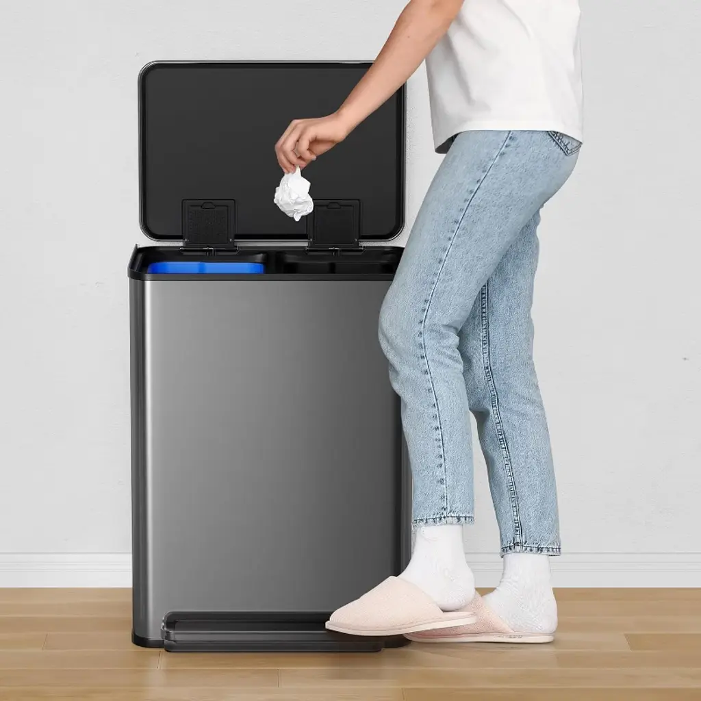 Upgrade your kitchen with this 2x8 gallon dual compartment trash can. Featuring a soft-close lid, rust-resistant stainless steel, and removable inner buckets for easy cleaning, it makes separating trash and recycling simple and stylish. The sturdy foot pedal and side handles ensure hands-free, convenient use every day.