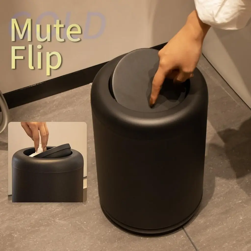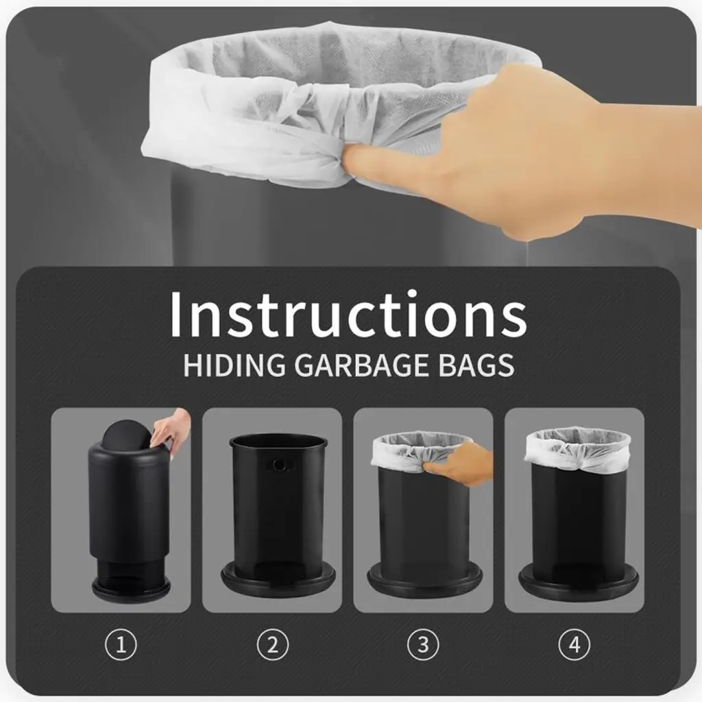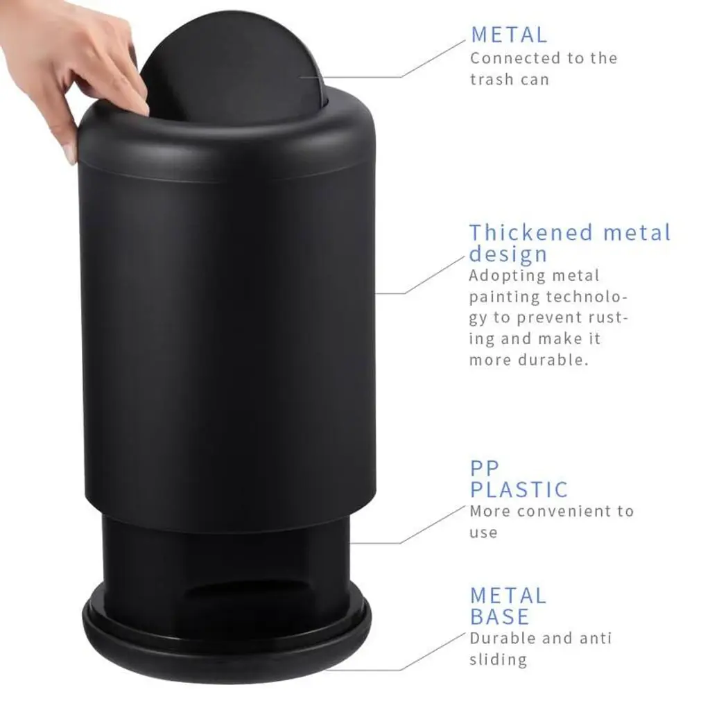 UNIQUE DESIGN: The top swivels for easy daily use and also insulates from odors and keeps pets out. MADE OF METAL: This elegant waste basket is made of solid iron with a baked enamel finish, thickened for durability, waterproof and rustproof. UTILITY: 3 gallons, perfect for bathrooms or places where space is limited. HIDDEN TRASH BAG: Double-layer design, take out the outer bucket can be put directly into the garbage bag, easy to access, no need to touch the garbage when you dispose of it, keep your hands clean. Trash Bag Snap: Secures standard trash bag to inner bucket fixture, preventing bag from slipping out. EASY MAINTENANCE: Finish naturally hides fingerprints, smudges and dirt. Product size: 8.5 inches x 8.5 inches x 13 inches