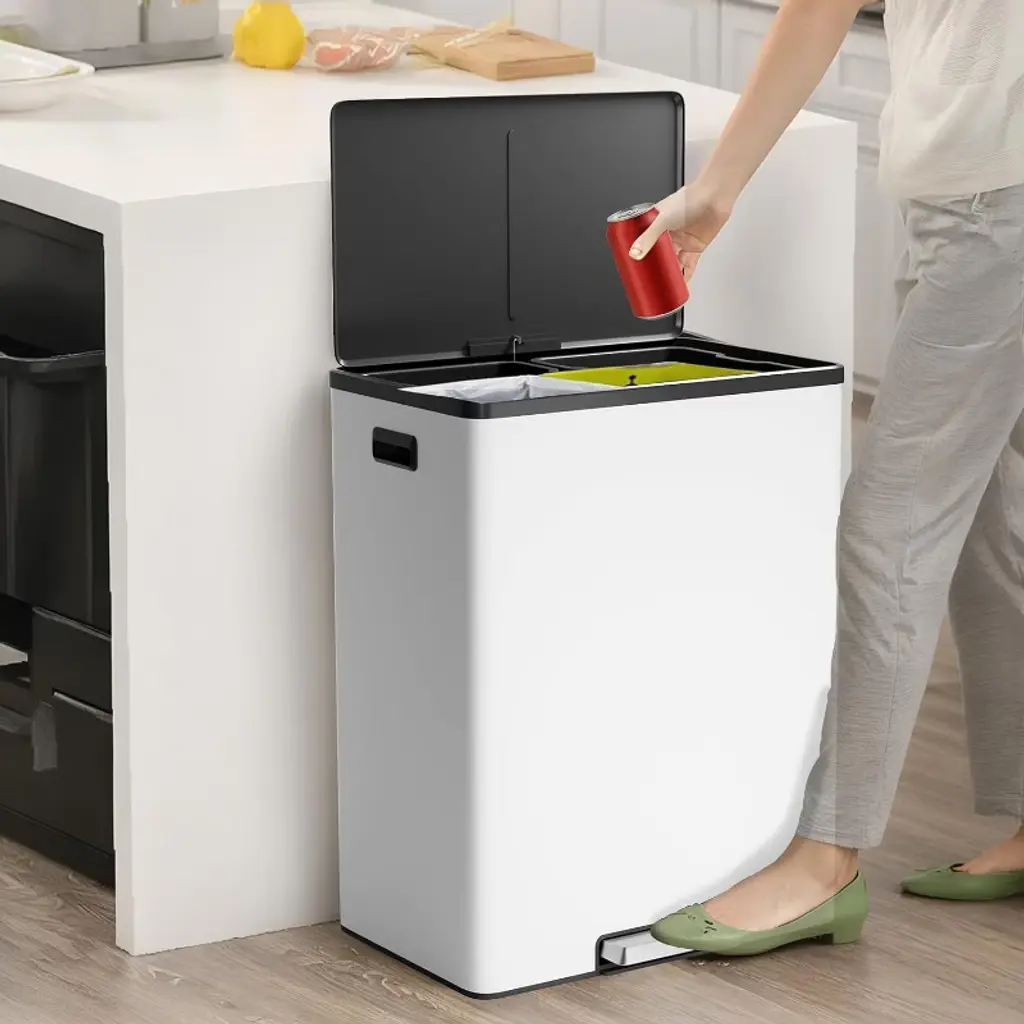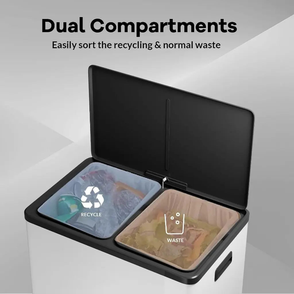 Material : This dual recycling bin is crafted from high-quality, sturdy materials designed to ensure durability and long-lasting use. Its robust construction supports daily use in various environments, resisting wear and maintaining its structural integrity over time. Color Options: The bin is available in a neutral color that seamlessly fits into any office, bedroom, or bathroom setting, enhancing the overall aesthetic without drawing unnecessary attention. Dimensions and Capacity: Featuring two separate barrels, each with a generous 30-liter capacity, this bin offers a total of 62 liters of waste management space. The design is compact yet spacious enough to handle significant amounts of recycling or waste. Features and Benefits: Equipped with a convenient step-on pedal, the bin allows for hands-free operation, promoting hygiene and ease of use. The soft-close lid mechanism ensures quiet and smooth closing, preventing noise disturbances. Each barrel is removable, making it simple to empty and clean, thus maintaining a sanitary environment. Design and Aesthetics: The sleek and practical design of this dual recycling bin fits well in various spaces, from home kitchens to office corners. Its modern look complements contemporary interiors while providing a functional solution for waste separation. Additional Functionalities: The two removable barrels enable efficient sorting of recyclables and general waste, encouraging environmentally friendly practices. The lids help contain odors and keep waste out of sight, contributing to a cleaner and more pleasant space. Packaging and Accessories: The product comes complete with two removable barrels, lids, and a step-on pedal mechanism. It is packaged securely to prevent damage during shipping and includes a user manual for easy assembly and maintenance. Care Instructions: To keep the bin in optimal condition, simply wipe it down with a damp cloth. Regular cleaning of the removable barrels will prevent odors and maintain hygiene.