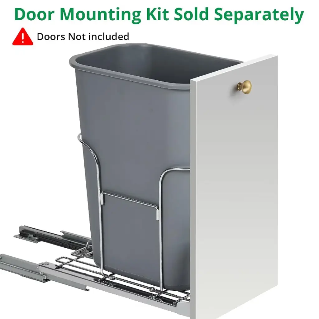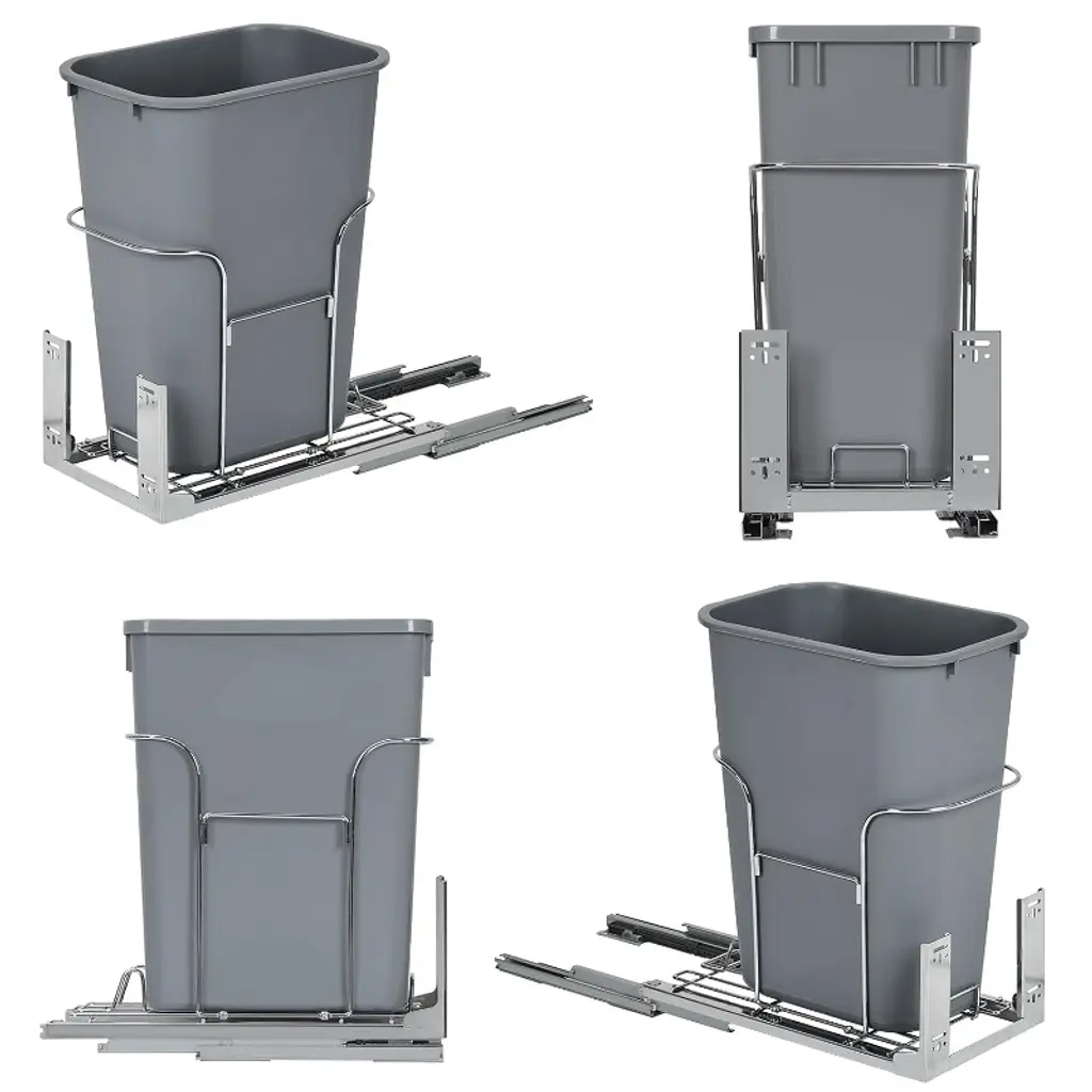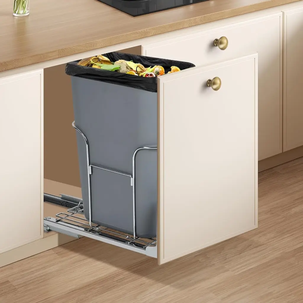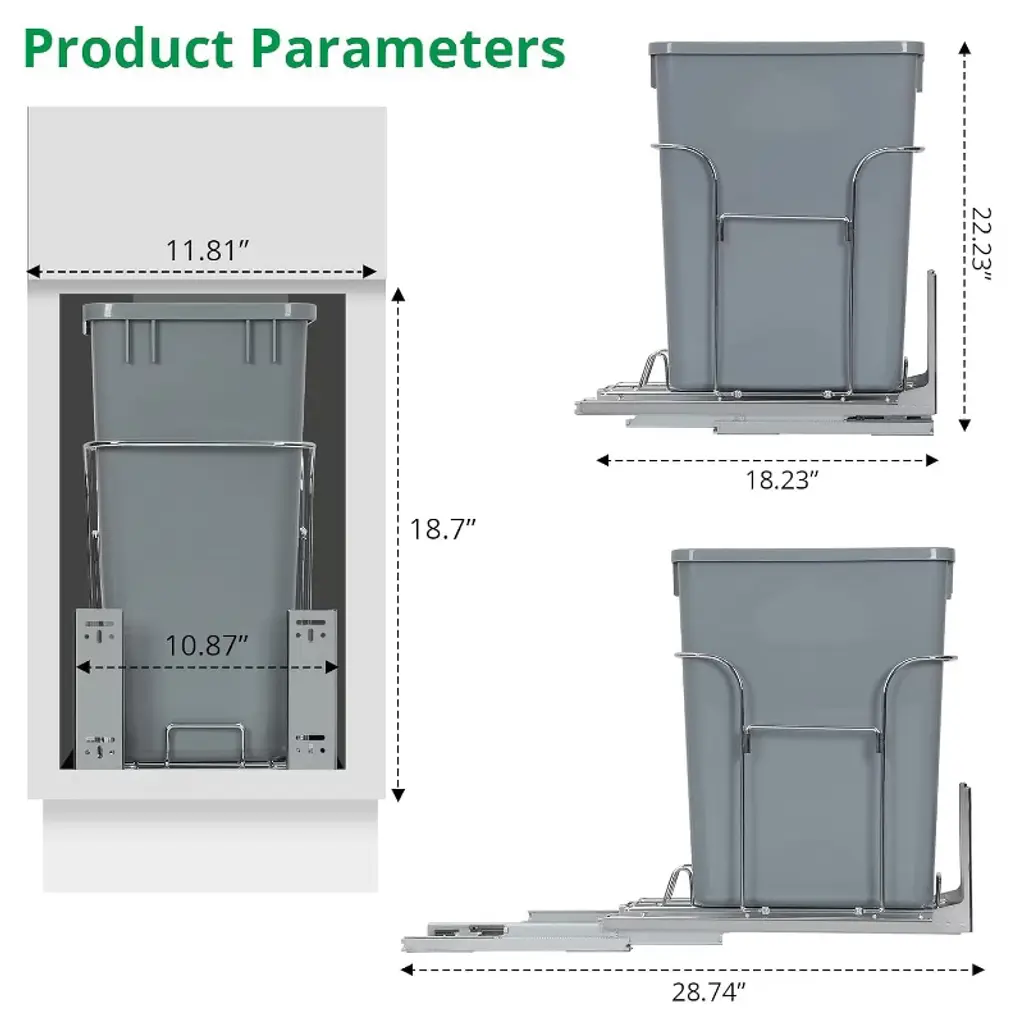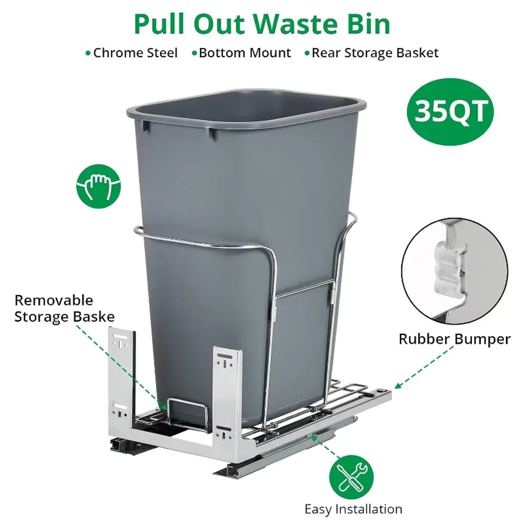 Revolutionize your kitchen waste management with this 35 quart pull out trash can featuring a compact space-saving design that hides garbage containers while keeping them easily accessible. Ideal for under cabinet storage, it offers hygienic convenience with stainless steel bins supported by a thickened bracket that bears up to 100 pounds without deformation. Smooth and quiet operation is ensured by a solid ball bearing slide system, while the removable handle allows door mounting. Dimensions: Capacity: 35 quarts Bracket supports up to 100 pounds without deformation Fits standard under-cabinet spaces with adjustable mounting options Soft close full extension ball bearing slides ensure smooth glide Includes removable handle for flexible mounting What You Get: One 35 quart pull out kitchen trash can with light greyish blue stainless steel construction Rustproof thickened bracket and solid ball bearing slides Removable handle for cabinet door mounting All installation hardware and detailed instructions included After-Sales Service: We provide clear assembly instructions and all necessary hardware to facilitate easy installation. Our dedicated customer service team is available to assist with any questions or concerns to ensure your complete satisfaction and smooth setup experience.