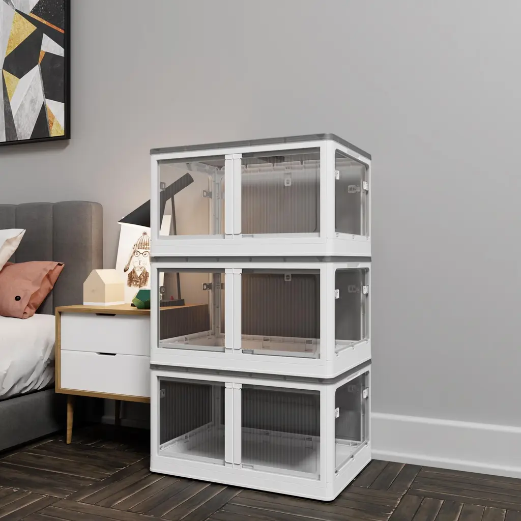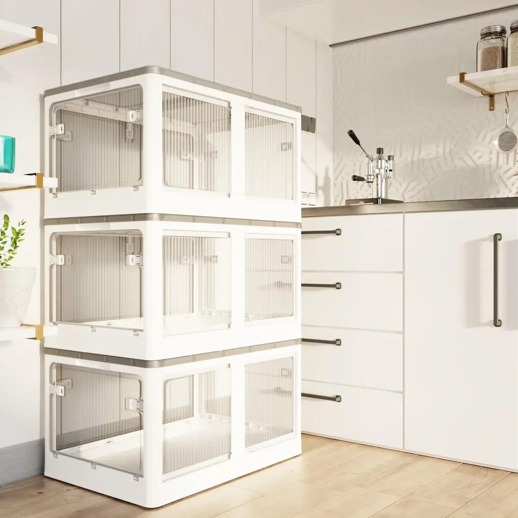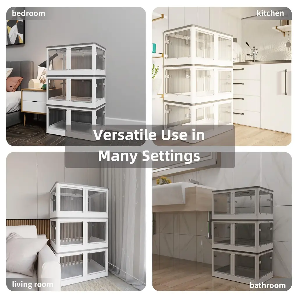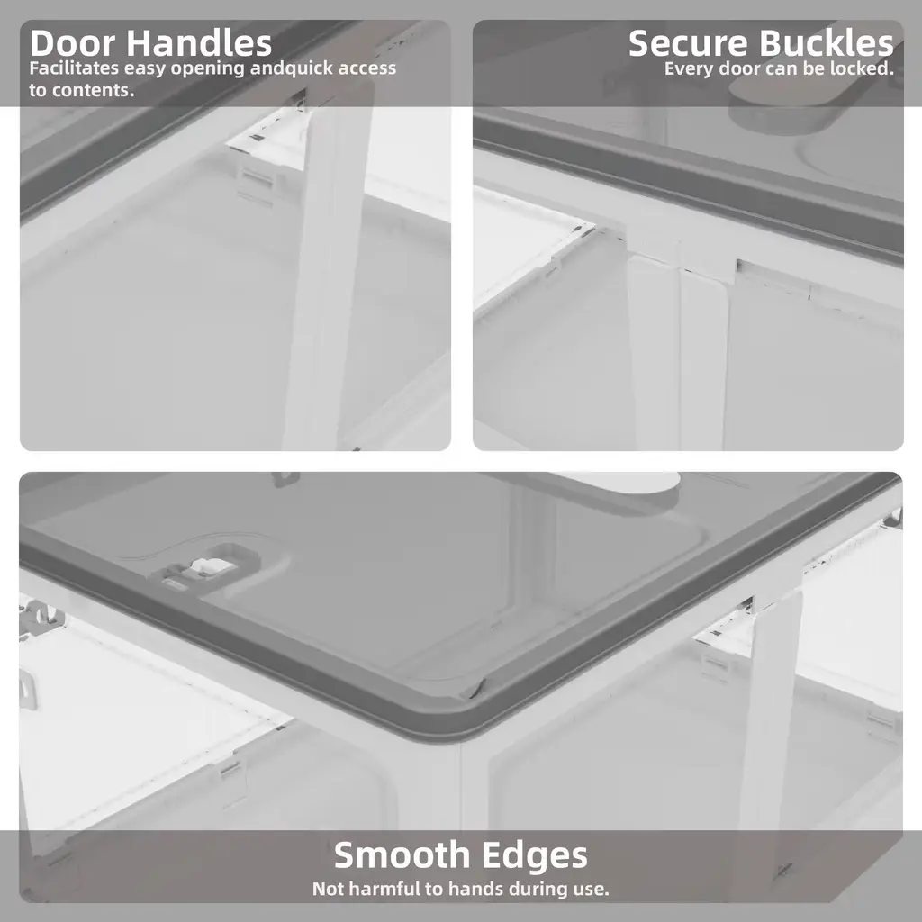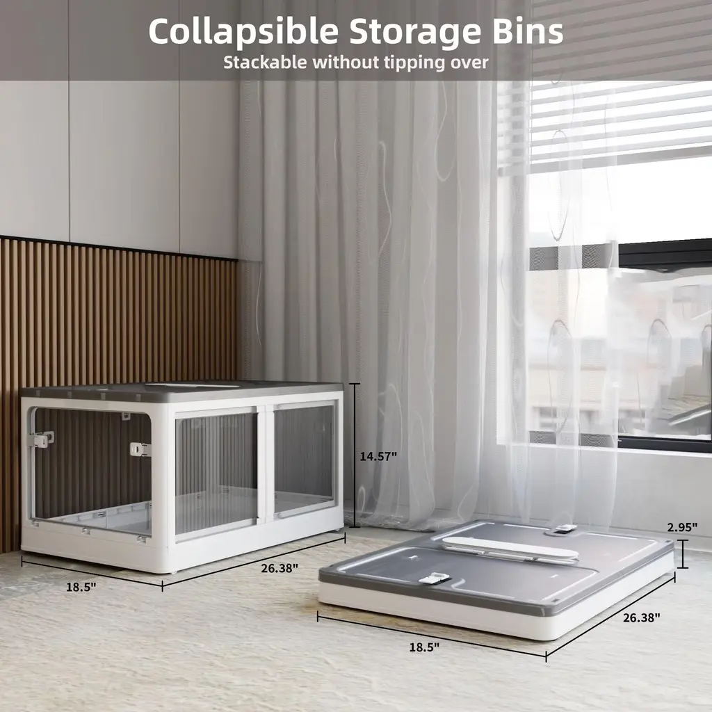 【No Need to Install and Collapsible】 : The storage bins with lids comes in flat station, just raise up 4 panels and tighten them together, and close the lid then you could start to use this plastic storage bins. No need tools to install them. When they are not in use, the collapsible storage bins can be folded up and stay under the sofa, will not take up space. 【Visual Design for Easy Searching】: These stacking storage bins feature transparent panels on all five sides, allowing you to easily and quickly see what's inside. They offer a perfect blend of style and functionality. 【5 Ways to Open】: The folding storage container opens in 5 ways——a lid at the top, a door at the front and 3 doors at the other sides. The top lid lets you quickly store items, while the front door provides easy access without needing to move or remove items from the top. 【Durable & Stackable】: The plastic storage bins with lids are crafted from premium, sturdy, and heavy-duty materials, ensuring durability. The groove design on these foldable storage boxes allows them to stack up securely without tipping over. 【Versatile Storage 【Organizer with Wide Application】: The big storage cabinets are ideal for sorting out toys, crafts, photos, clothes, hats, snacks, food, medicines, etc. Our stackable storage bins with handles offers a highly adaptable and flexible storage option to suit your different needs kitchen cabinet organizer, bathroom organizer, closet clothes organizers, laundry room organization, dorm essential storage box, classroom book storage bins, snack storage container, toys storage organizer, car trunk, camping storage bins, office storage bins, etc. 【Easy Movement】: With the wheels on the bottom, you can easily move the plastic dorm storage bins. 【Large Storage Capacity】: The size of each storage organizer is 26.38"L × 18.5"W ×2.95"H. These space-saving bins are essential for home organization, providing an ideal solution to keep your home neat and organized.Contact US:After-sales Email Address: dhalcomb@doorise.comIf the item comes with any defect, damage(include damaged in transit) or missing partsand, please contact us with detailed images for free replacement or refund.