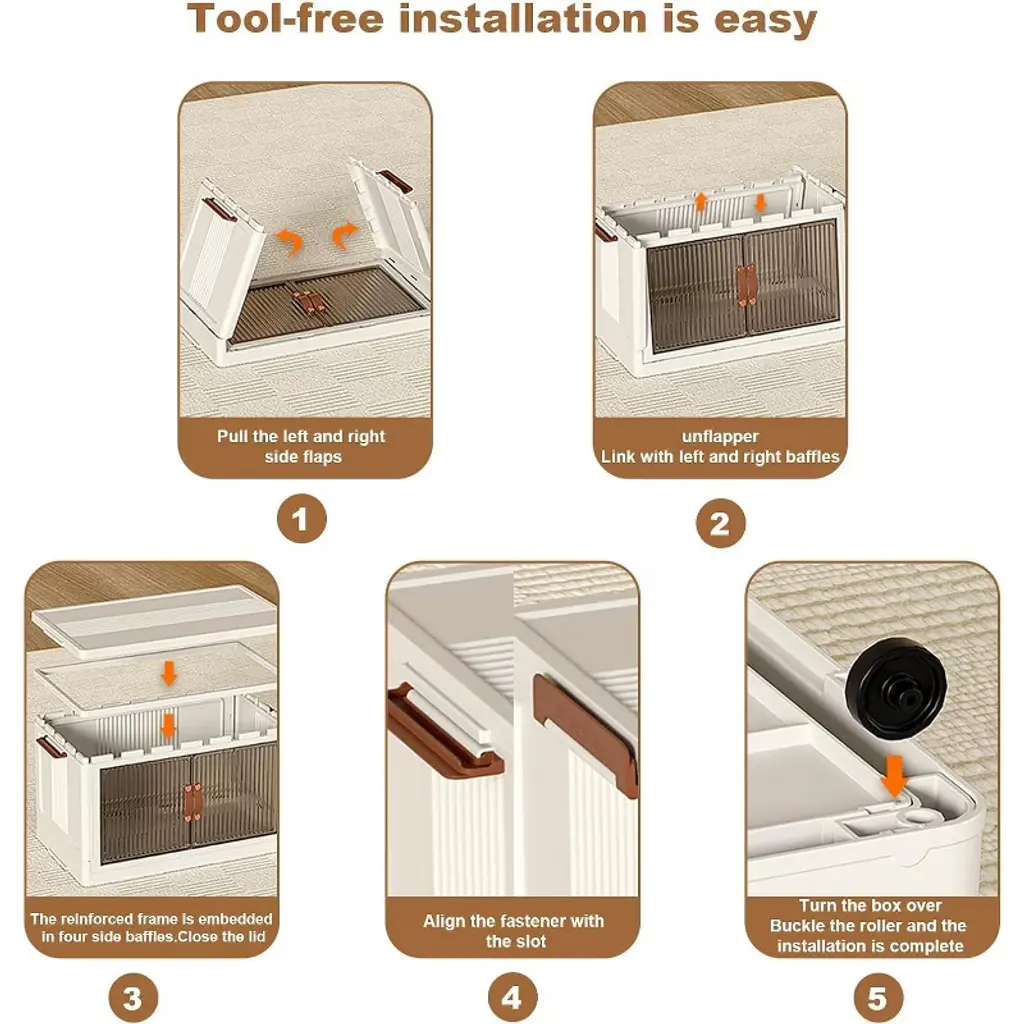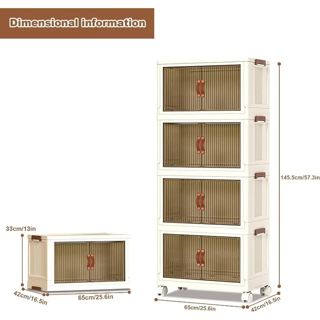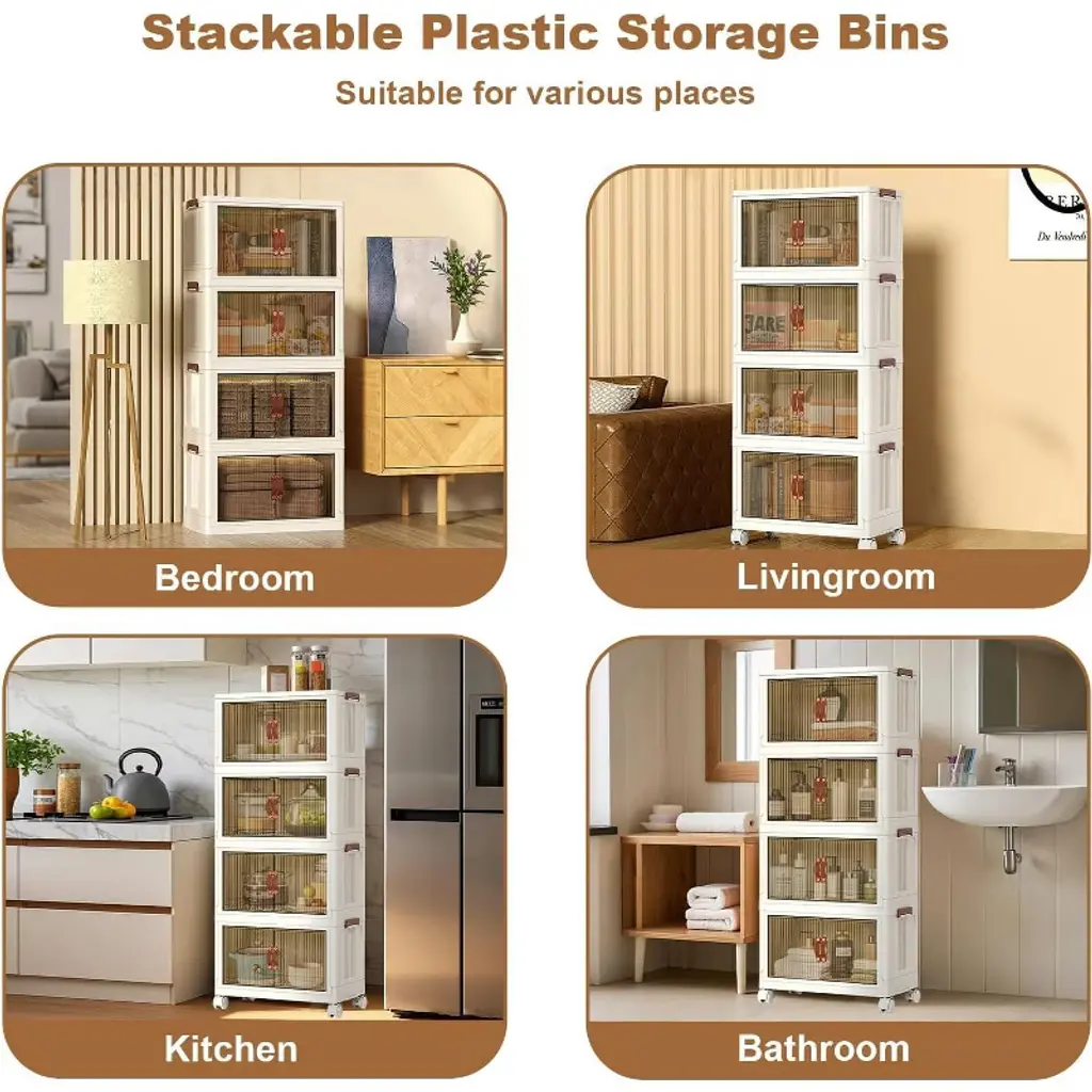 4 Tier 72qt Stackable Plastic Storage Bins, Foldable Storage Boxes With Wheels Double Magnetic Door For Home Office Dorm Bedroom Living Room