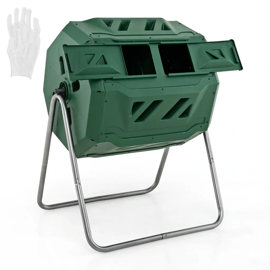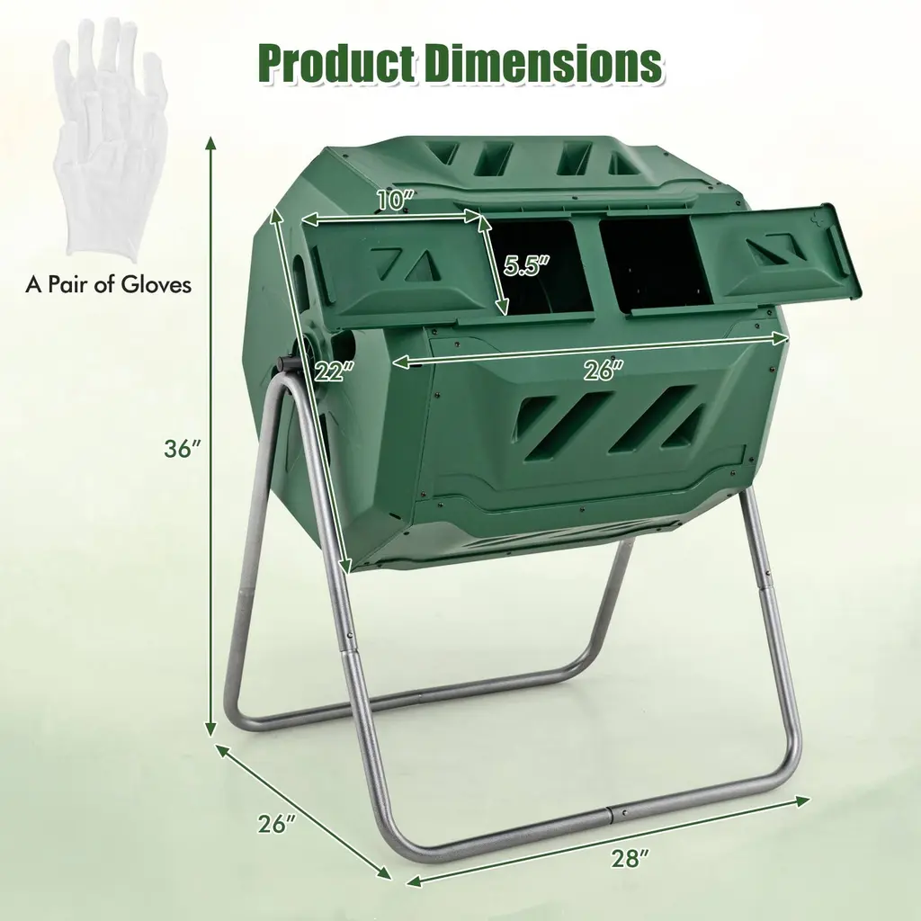 Specifications:Description:This green compost tumbler features a practical dual-chamber design, allowing for continuous composting by rotating between two chambers, so you can add fresh scraps while the other side solidifies. The convenient aeration system, with air holes and deep fins, ensures effective breakdown of food scraps. Its 43-gallon capacity offers ample space for composting, perfect for urban gardens. The rotatable design makes it easy to produce mature compost without manual mixing, while large doors and openings simplify waste addition and compost removal. Built with durable PP and a powder-coated steel frame, this composter is designed to withstand all weather conditions for long-term outdoor use.Key Features:● Practical Dual-Chamber Design: Featuring 2 rotating chambers, the outdoor compost barrel allows you to add fresh compost ingredients to one side while waiting for the other side to solidify. Thus two sides are constantly swapped to continuously produce rich and healthy compost in the short term.● Convenience Aeration System: The compost bin is equipped with aeration holes to provide excellent air circulation, so as to provide effective composting for you. Meanwhile, the deep fins can break down the clumps of the compostable food scraps from inside.● Rotatable Composter: Thanks to the rotating design, obtaining mature compost is easier and more efficient without having to dig, turn, and mix by hand. Just open the sliding door and fill it up with scraps, rotating 5-6 times every 2 days.● Large Capacity Compost Bin: The tumbling composter has a capacity of 43 gallons, making it easy to recycle food waste. It is suitable for composting in urban areas to supply nutrients to the garden. Further, large openings and movable doors simplify adding waste and removing compost.● All-weather and Durable Material: The main body of the compost container is made of durable PP, which is weather-resistant and won't degrade under sunlight for long-term outdoor use. Meanwhile, the powder-coated metal frame is strong and corrosion-resistant.