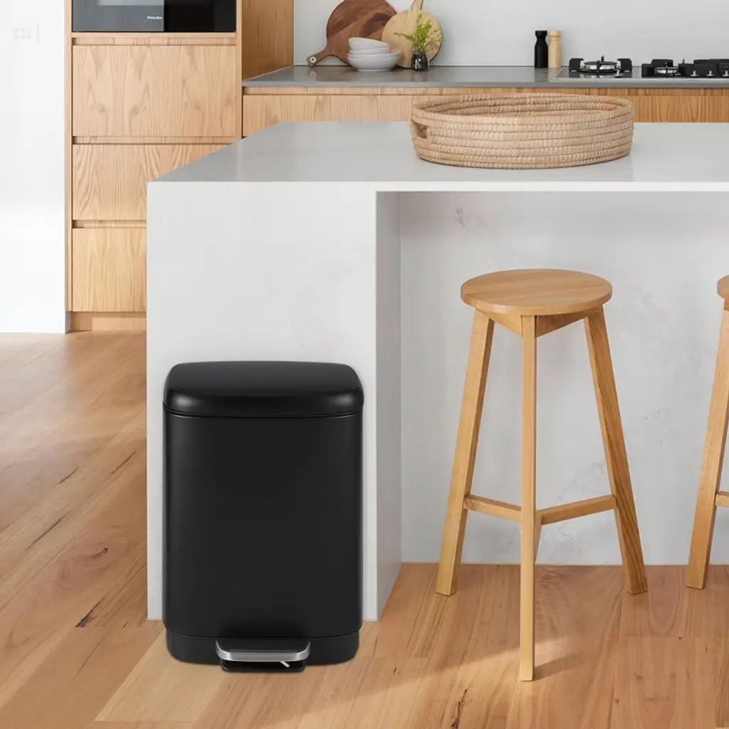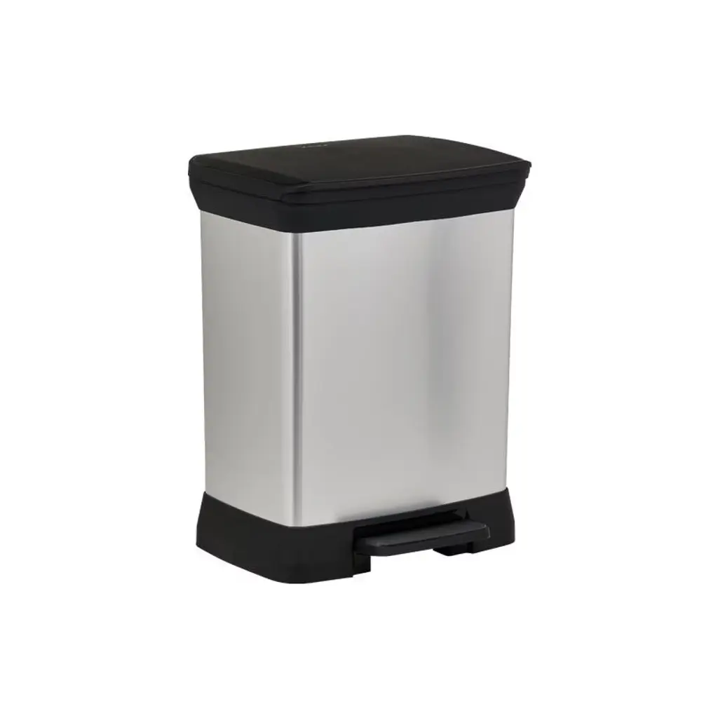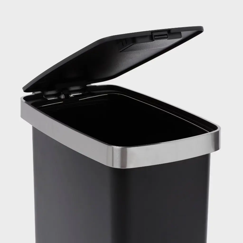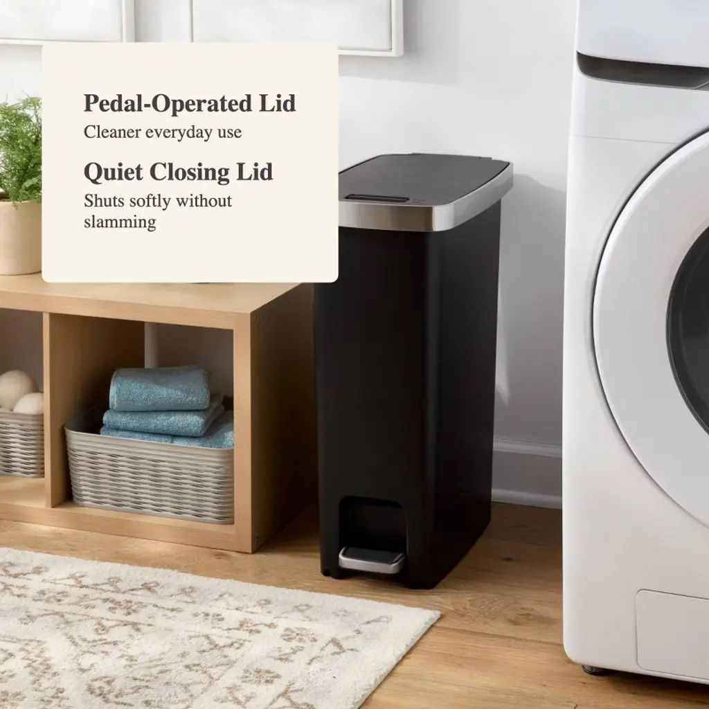 Store trash neatly out of sight in any room with this 45-Liter Slim Resin Step Trash Can with Stainless Steel Band from Brightroom™. Made from black plastic resin, this trash can also features a stainless steel band with a silver finish below the top. Designed with a tall, slim silhouette, it has a quiet-closing, pedal-operated locking lid for convenient hands-free use.Brightroom™: See your space in a new light.