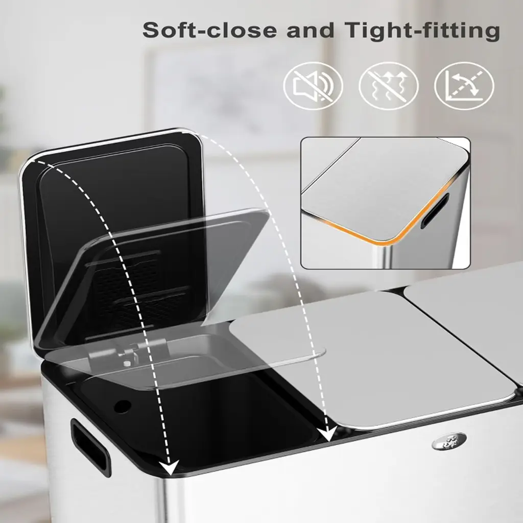 60l Three Compartment Trash Can With Soft-close Lid, For Kitchen, Home Office, Restaurant, 3X5.3gal