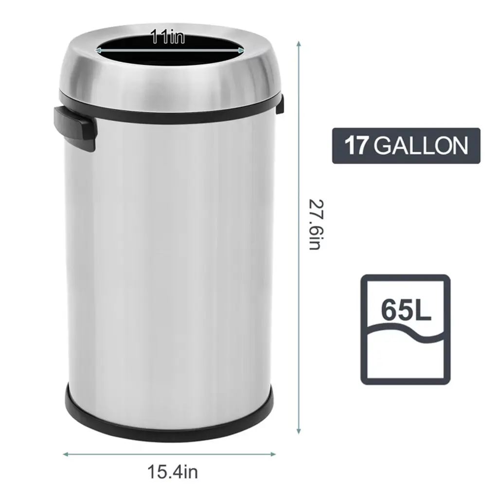 65 Liter Open Top Trash Can, Commercial Grade Heavy Duty Brushed Stainless Steel Garbage Can Large Waste Bins, Outdoor | Home | Kitchen