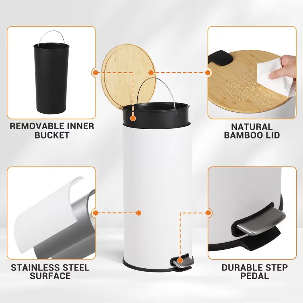 Elevate your space with this stylish 8-gallon step trash can—featuring a soft-close bamboo lid, hands-free pedal, removable inner bucket and a sleek stainless steel finish perfect for any room!Highlights at a Glance:- Step trash can with soft close bamboo lid- Removable inner bucket for easy cleaning - Hands-free kitchen trash can with lid - Sleek stainless steel garbage bin - 8 gallon trash bin for small spaces - Stylish rubbish bin for kitchen, bathroom, or living roomSpecification:Material: Stainless Steel+BambooProduct Dimension: 12x14.4x24.3 inchCapacity: 7.93 Gallon/30 LPacking List:1xTrash Can1xInner Bucket1xInstruction ManualNote:Before making a purchase, consider factors like height, width, depth and capacity to ensure the size of the trash can you are considering fits your need.To maintain appearance, regularly clean the surface of the trash can with a mild cleaner and soft cloth, avoiding the use of frosted materials to prevent scratching the stainless steel surface.