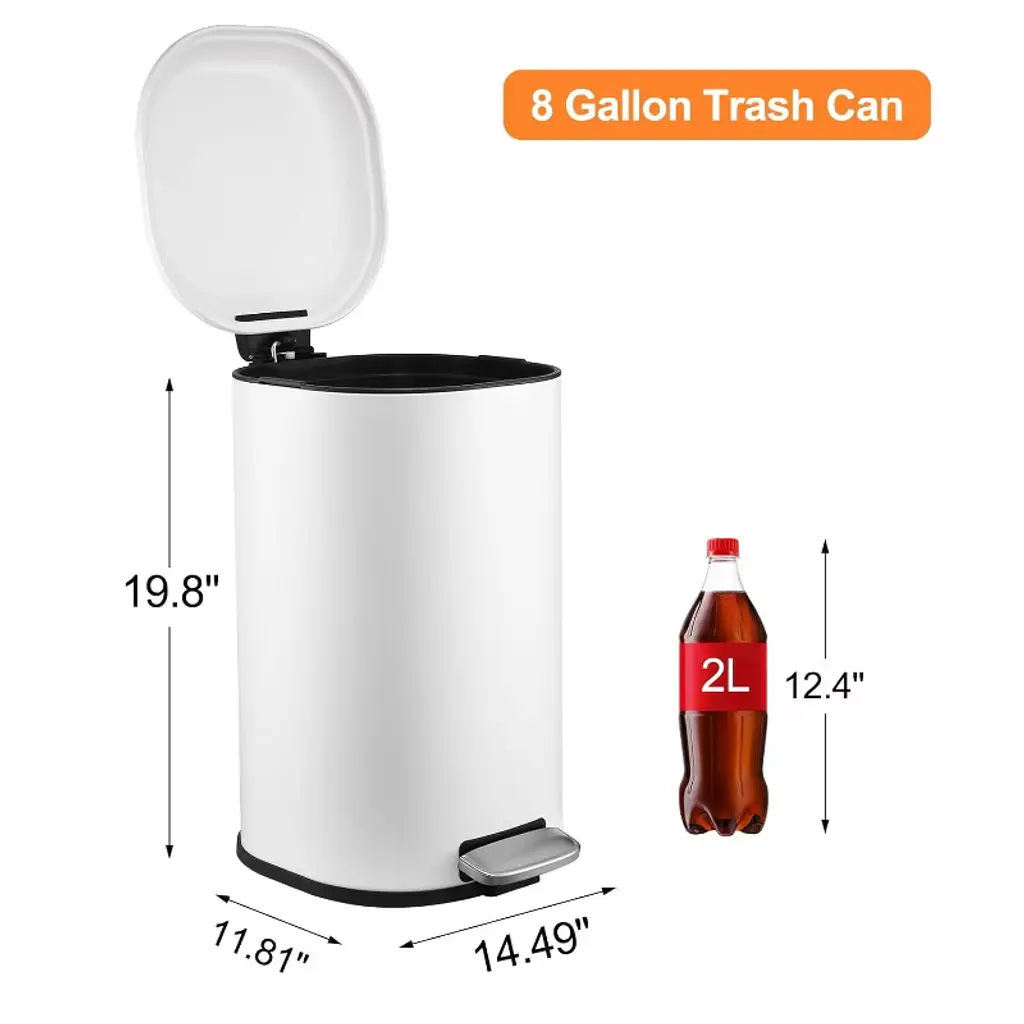 Introducing the 8 Gallon/30L Trash Can, the perfect blend of style, functionality, and durability for your home or office. Crafted from fingerprint-proof stainless steel, this trash can maintains a sleek, clean appearance even with frequent use. The soft-close lid ensures quiet operation, preventing loud slams and extending the life of the bin. Designed with a rectangular shape, this space-saving garbage can fits seamlessly into kitchens, laundry rooms, offices, bedrooms, and bathrooms. Its hands-free step pedal allows for hygienic, convenient use, making it ideal for busy households and workspaces alike. This modern trash can is not only practical but also eco-friendly. It doubles as a recycling bin, helping you keep waste sorted and your space organized. Whether you need an indoor trash can or a recycling bin, the 8 Gallon Trash Can is versatile enough to meet your needs. Key Features: - Durable fingerprint-proof stainless steel construction keeps your trash can looking spotless. - Soft-close lid prevents noise and reduces wear and tear. - Spacious 8-gallon capacity is perfect for kitchens, offices, and more. - Rectangular design maximizes space efficiency in any room. - Hands-free step pedal for hygienic and easy operation. - Suitable for indoor use in kitchens, laundry rooms, bedrooms, bathrooms, and offices. - Ideal for use as a recycling bin or general waste container. Upgrade your waste management with the 8 Gallon/30L Trash Can – a modern, practical, and stylish solution for every room in your home or workplace.