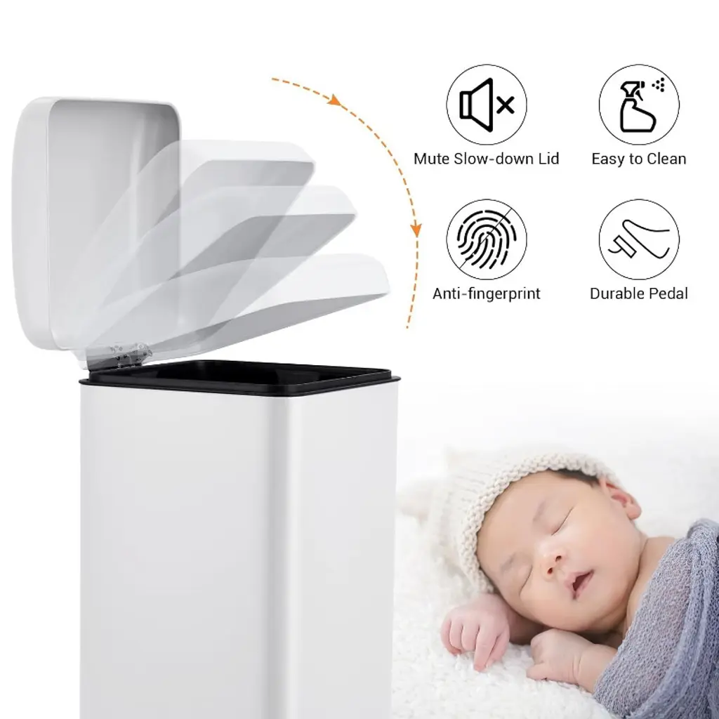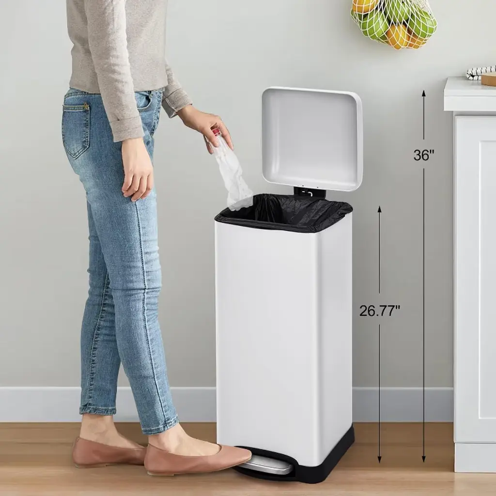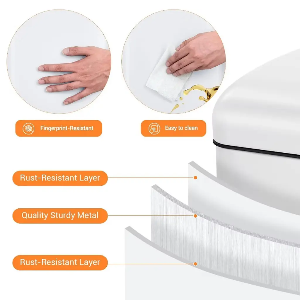 Convenient Cleaning: The inclusion of a removable bucket with metal handles allows for easy cleaning and maintenance of the trash can. In the event of spills or trash bag breakage, the bucket can be easily lifted out for quick and effortless cleaning, ensuring that the trash can remains hygienic and easy to maintain. Secure Waste Containment: The tight-sealing lid and advanced odor control system ensure that waste is securely contained within the trash can. The combination of a sealed lid and a removable bucket provides a double layer of protection against spills and leaks, keeping your space clean and free from waste-related messes. User-Friendly Design: Features such as the foot pedal for hands-free operation, silent lid operation, and removable bucket with metal handles make the trash can a user-friendly and convenient waste management solution. These design elements enhance the overall usability of the trash can, making waste disposal and maintenance tasks easier and more efficient for users. Enhanced Durability: Constructed from high-quality galvanized steel materials, the trash can is built to withstand daily use and is resistant to dents, scratches, and stains. This durability ensures that the trash can maintains its appearance and functionality over time, providing long-lasting reliability in waste management. Versatile Application: The stainless steel sensor trash can is suitable for a wide range of applications, including home use in kitchens, living rooms, and bathrooms, as well as in public spaces like office buildings, hotel lobbies, and restaurants. Its versatile design and convenient features make it an adaptable and practical solution for waste disposal in various environments, promoting cleanliness and hygiene throughout different settings.