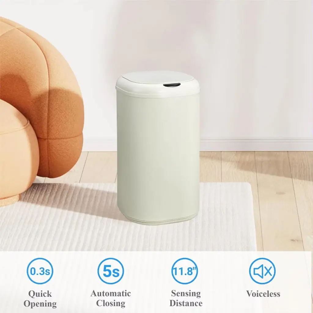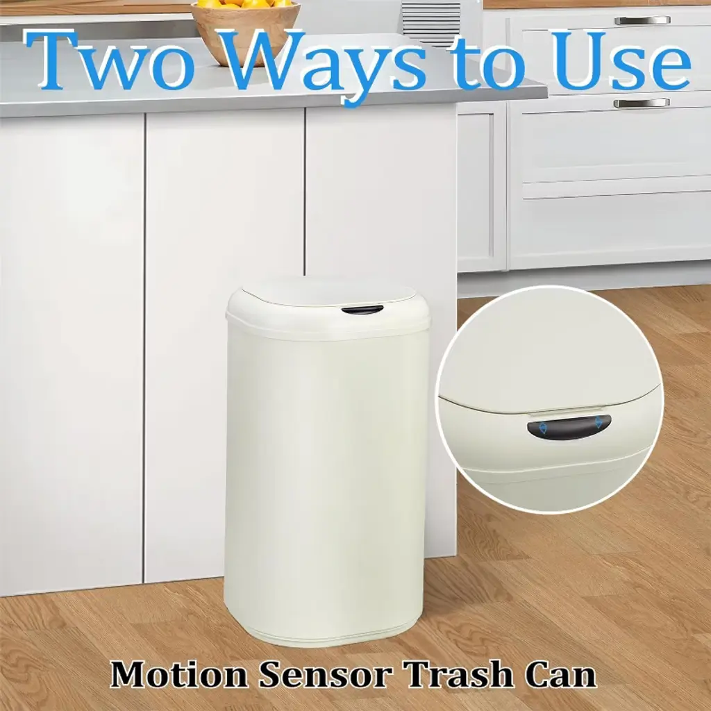 Specification:Color: BeigeMaterial: Stainless SteelDimensions: 11.42 x 11.42 x 20.47 inchesCapacity: 8 Gallon / 30 LiterHighlights at a Glance:Touchless 8-gallon motion sensor trash can for effortless, hygienic waste disposalPremium stainless steel with a stylish beige, waterproof, and fingerprint-resistant finishOdor-sealing lid keeps unwanted smells in and pets outSpace-saving cylindrical design perfect for kitchens, bathrooms, or home officesBattery-operated for a clean, cordless setupPacking List:1 ¡Á Trash Can1 ¡Á Instruction ManualNote:Before purchasing, check the height, width, depth, and capacity to ensure the trash can fits your needs.For best results, regularly clean with a mild cleaner and soft cloth. Avoid abrasive materials to prevent scratching the stainless steel surface.
